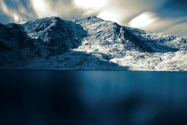 Montagne innevate sulla riva del lago