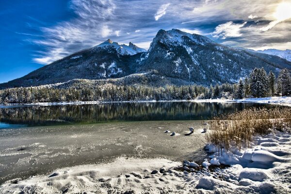 Paesaggio dell'europa nelle montagne innevate vicino all'acqua