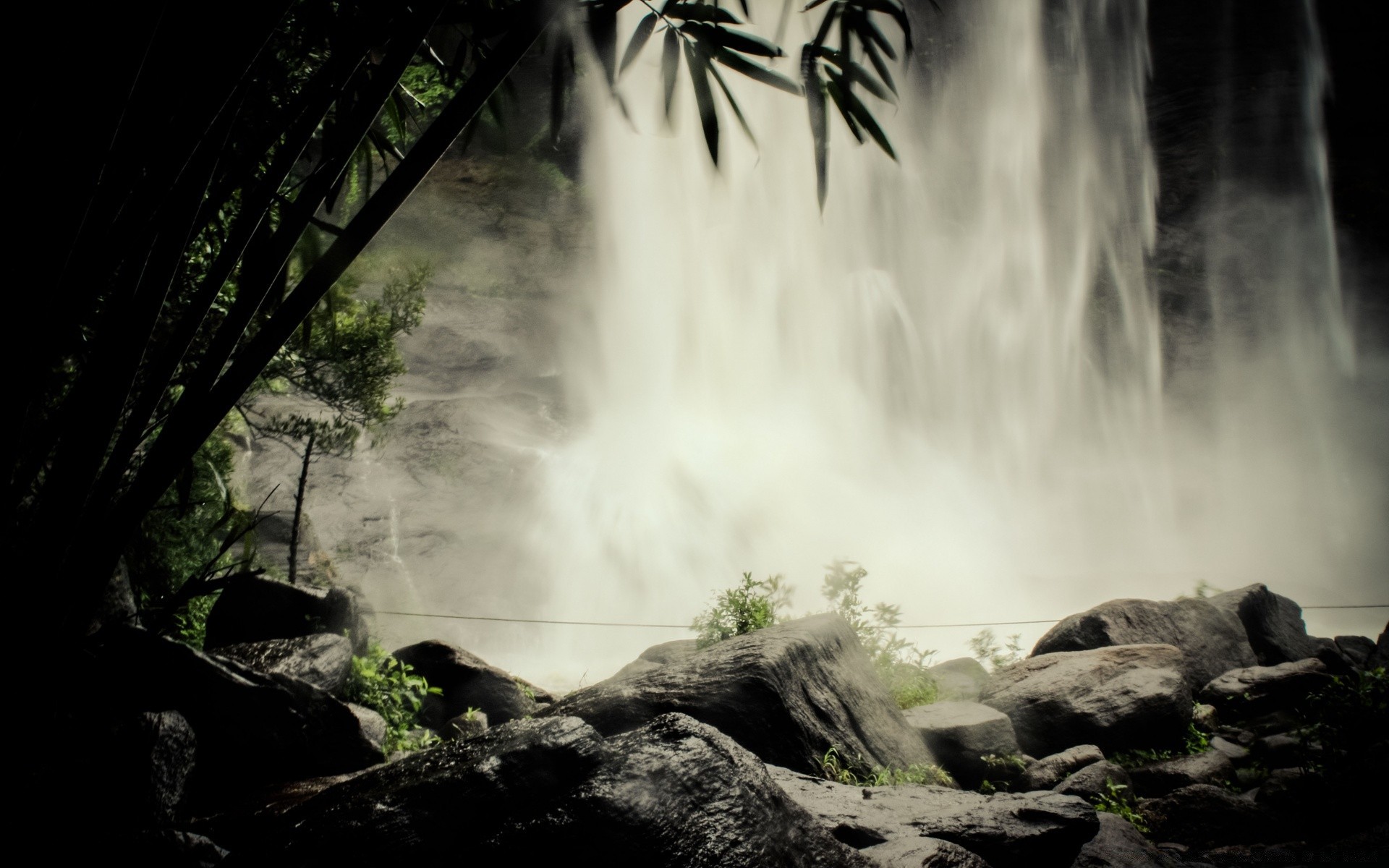 Pietre marroni tra una cascata su uno sfondo sfocato