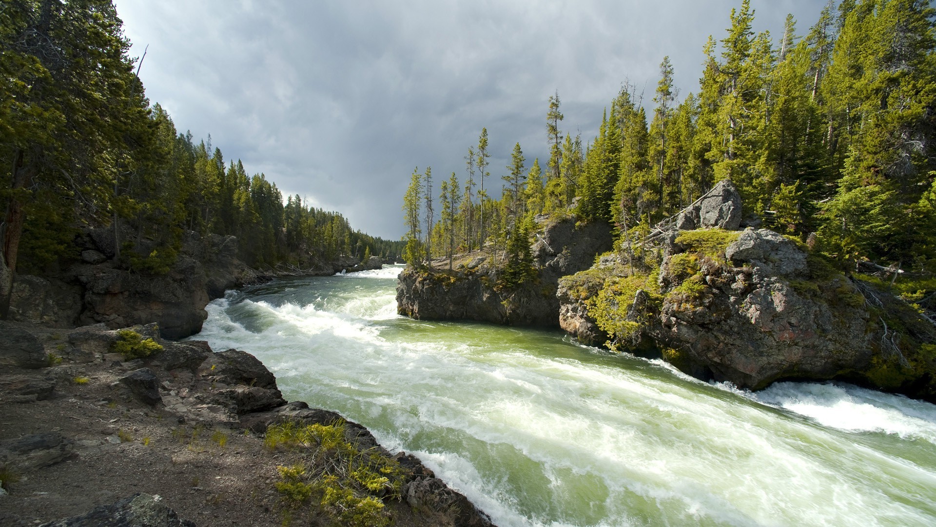 L'erba cresce sulle rocce nel mezzo di un fiume veloce