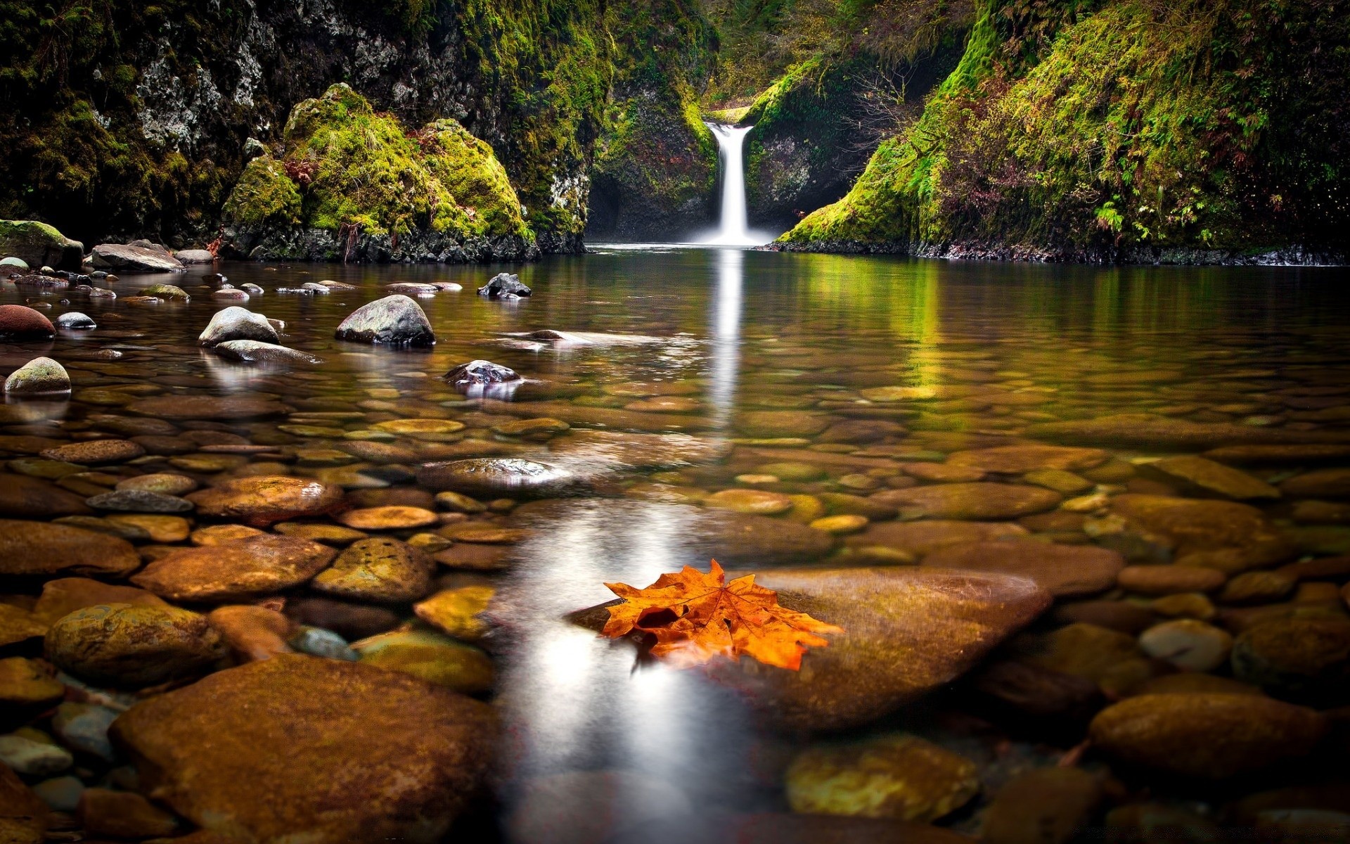 Fiume della foresta autunnale con grandi pietre