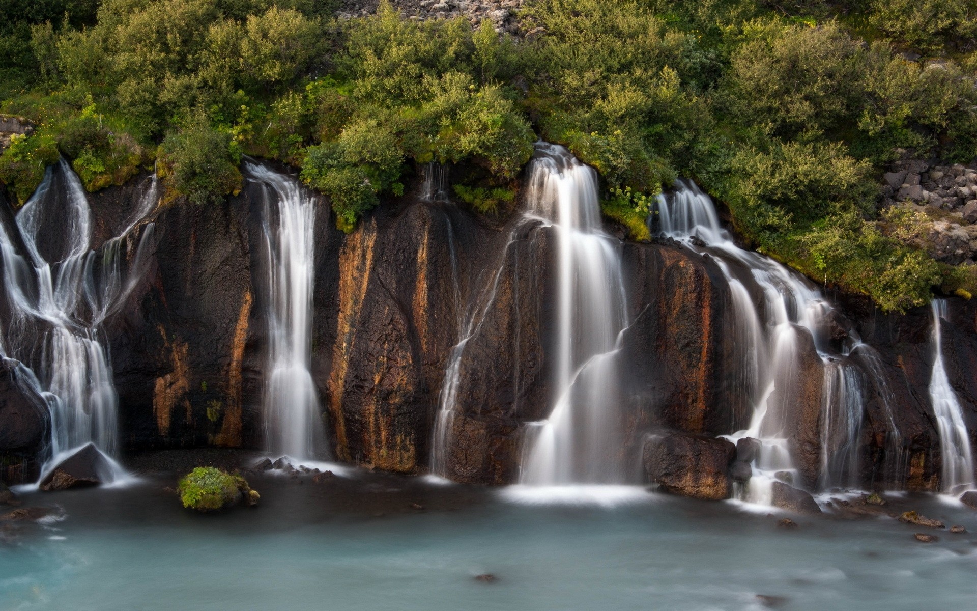 Diverse cascate e alberi verdi