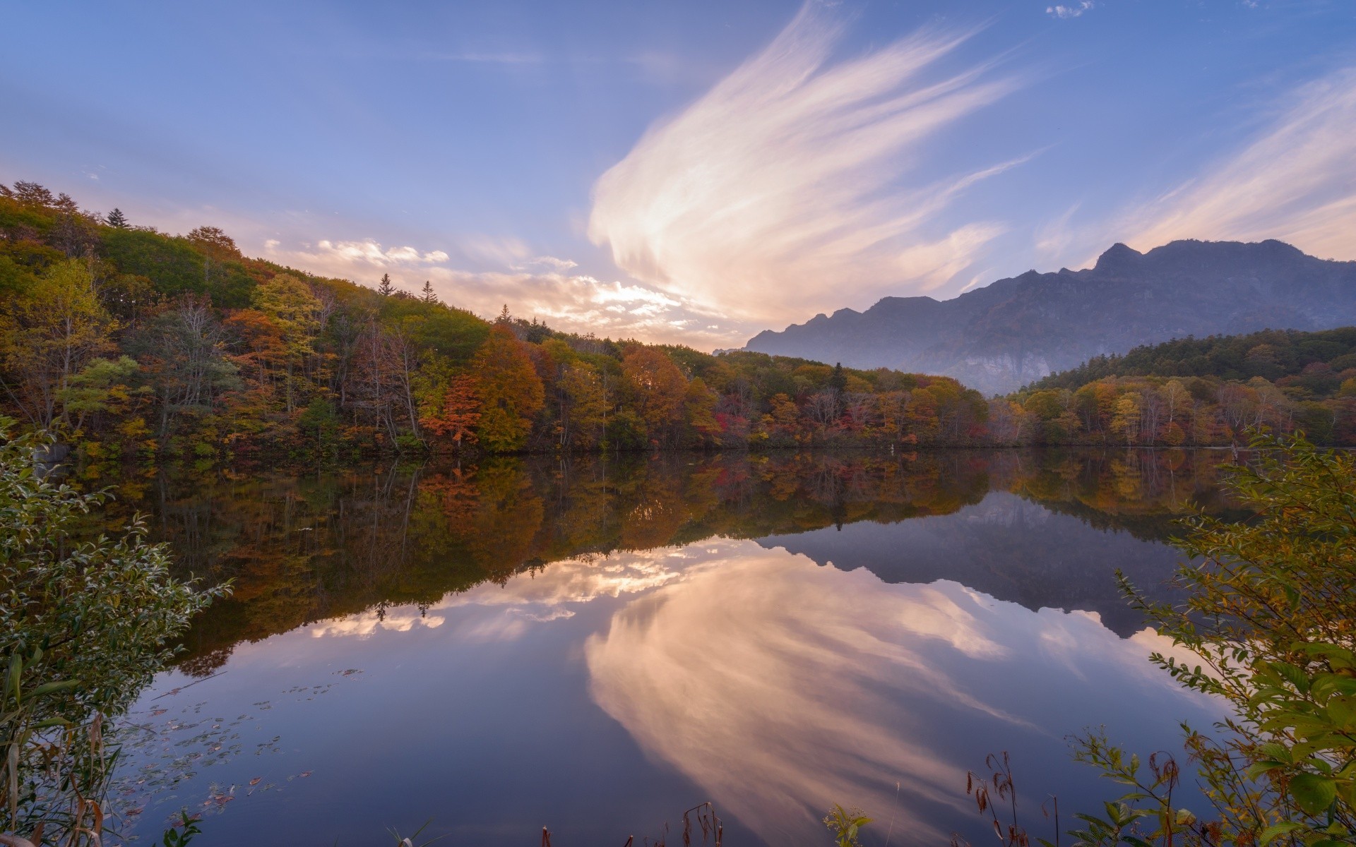 Il sole al tramonto che si estende oltre il bordo della foresta si riflette nella superficie dell'acqua
