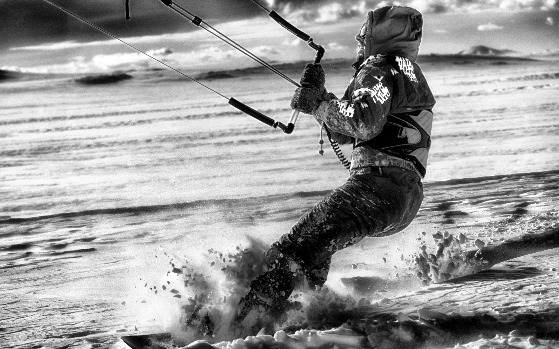 Fotografia in bianco e nero. Uomo che cavalca sulla neve su uno snowboard