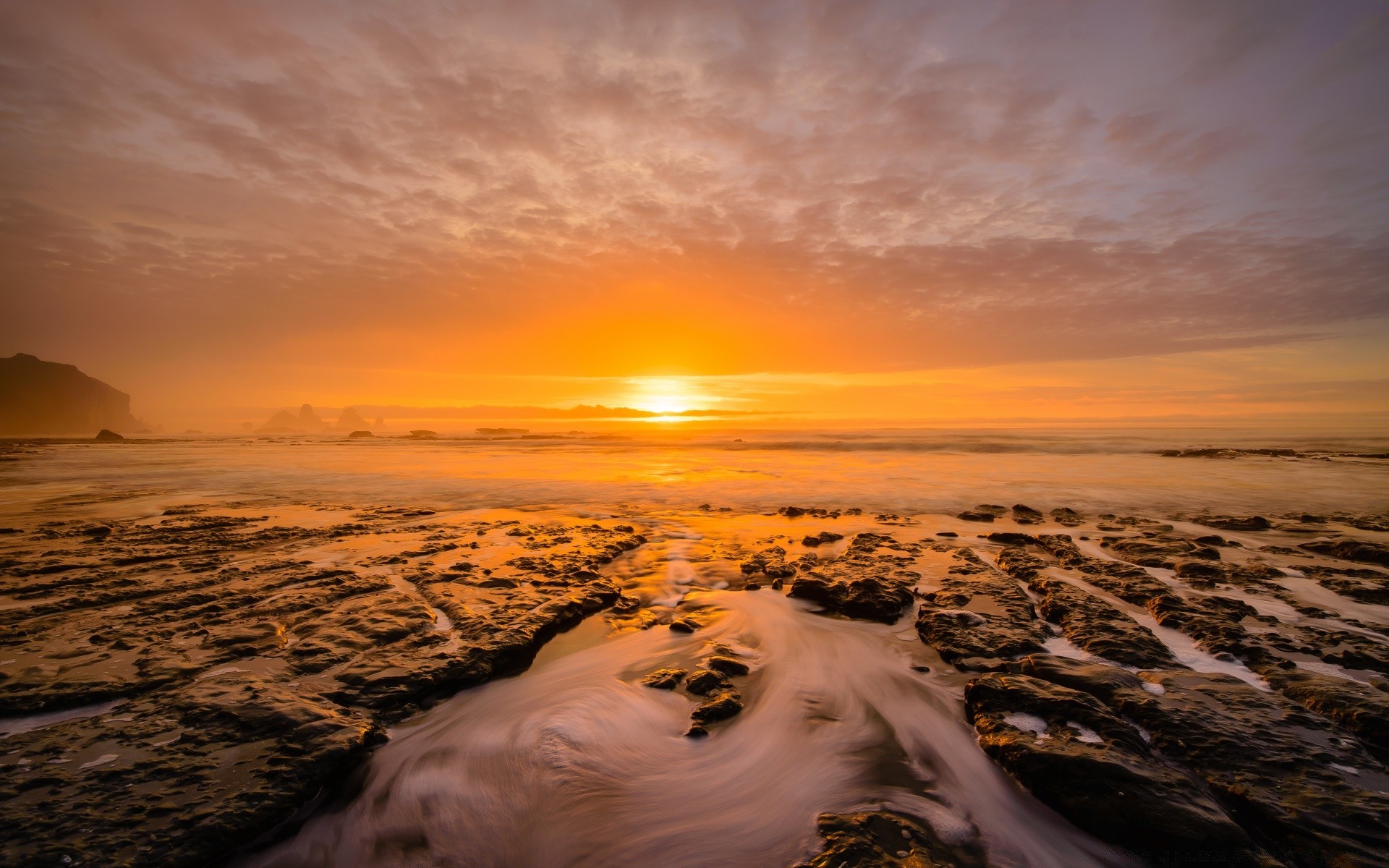 Tramonto sulla spiaggia tropicale, onde del mare leggero che si infrangono sulla sabbiaTramonto sulla spiaggia tropicale, onde del mare leggero che si infrangono sulla sabbia