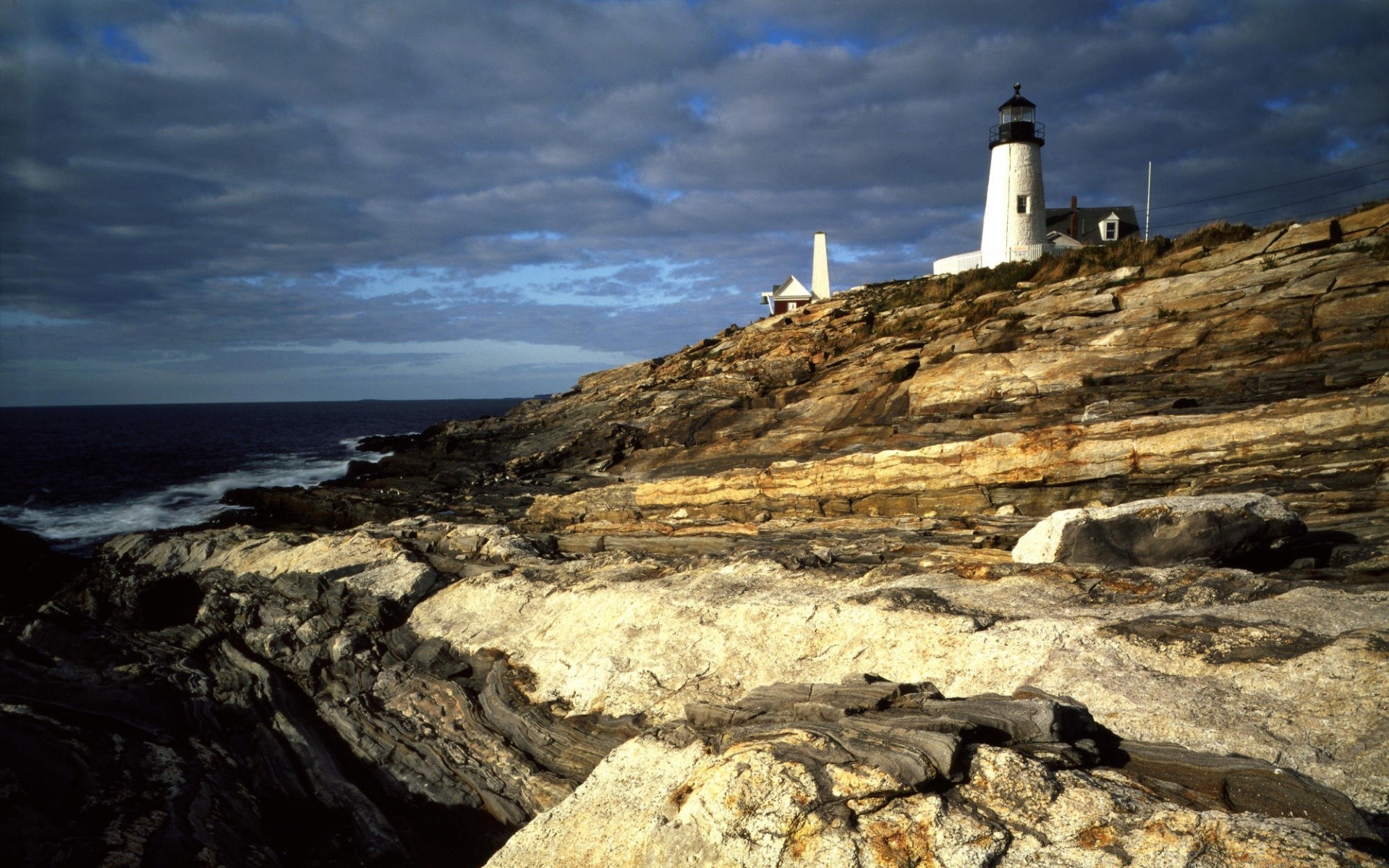 Faro sulla roccia sopra il mare alla luce rossa del sole in partenza