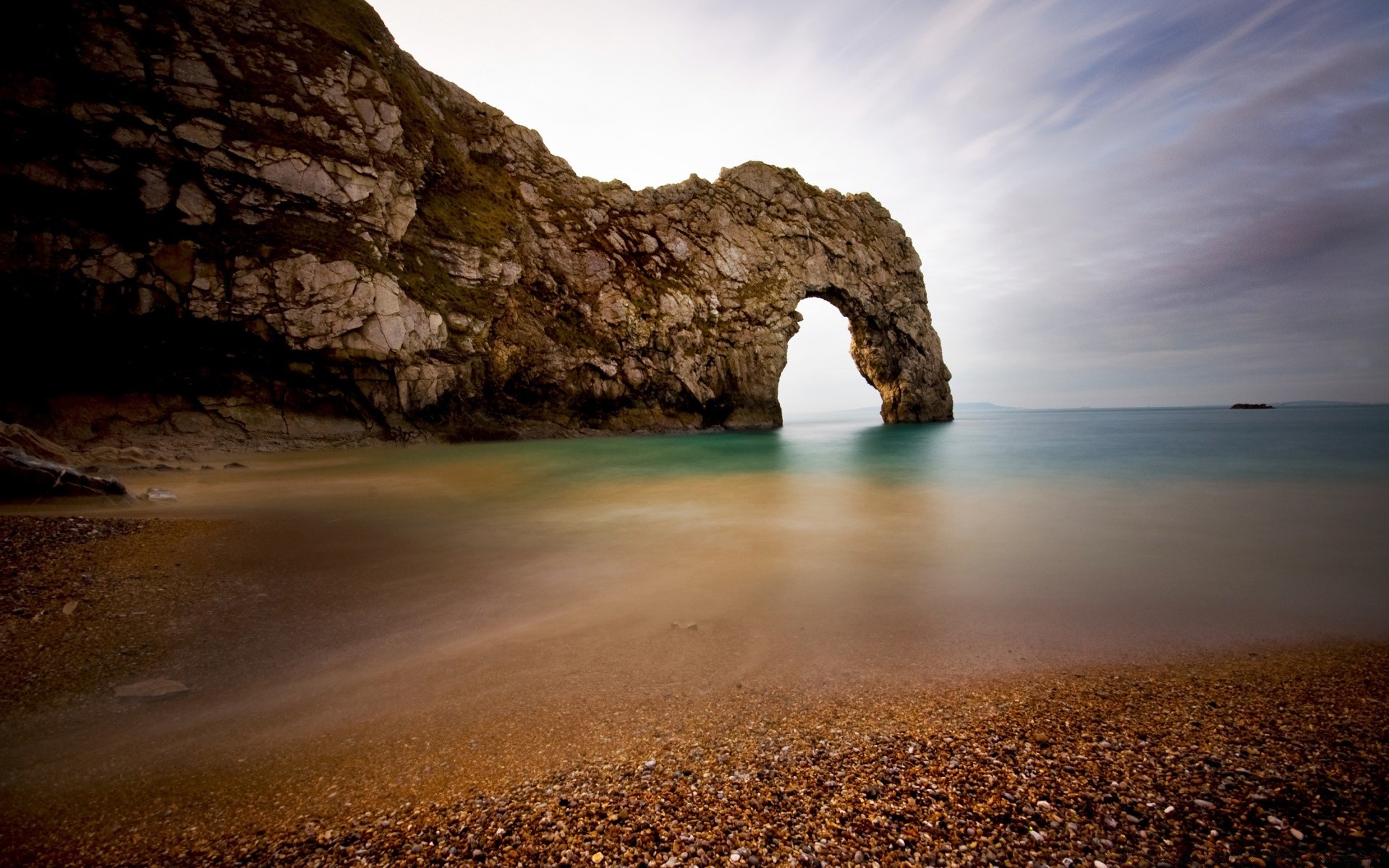 Spiaggia sabbiosa con massi rocciosi sullo sfondo del mare inquieto