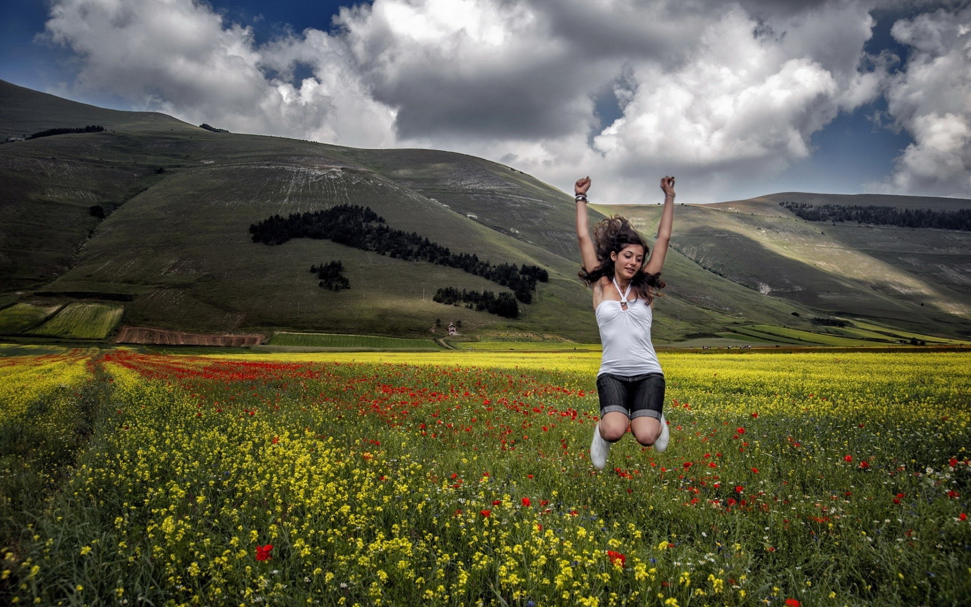 Paesaggio con una ragazza che salta in un campo sullo sfondo delle montagne