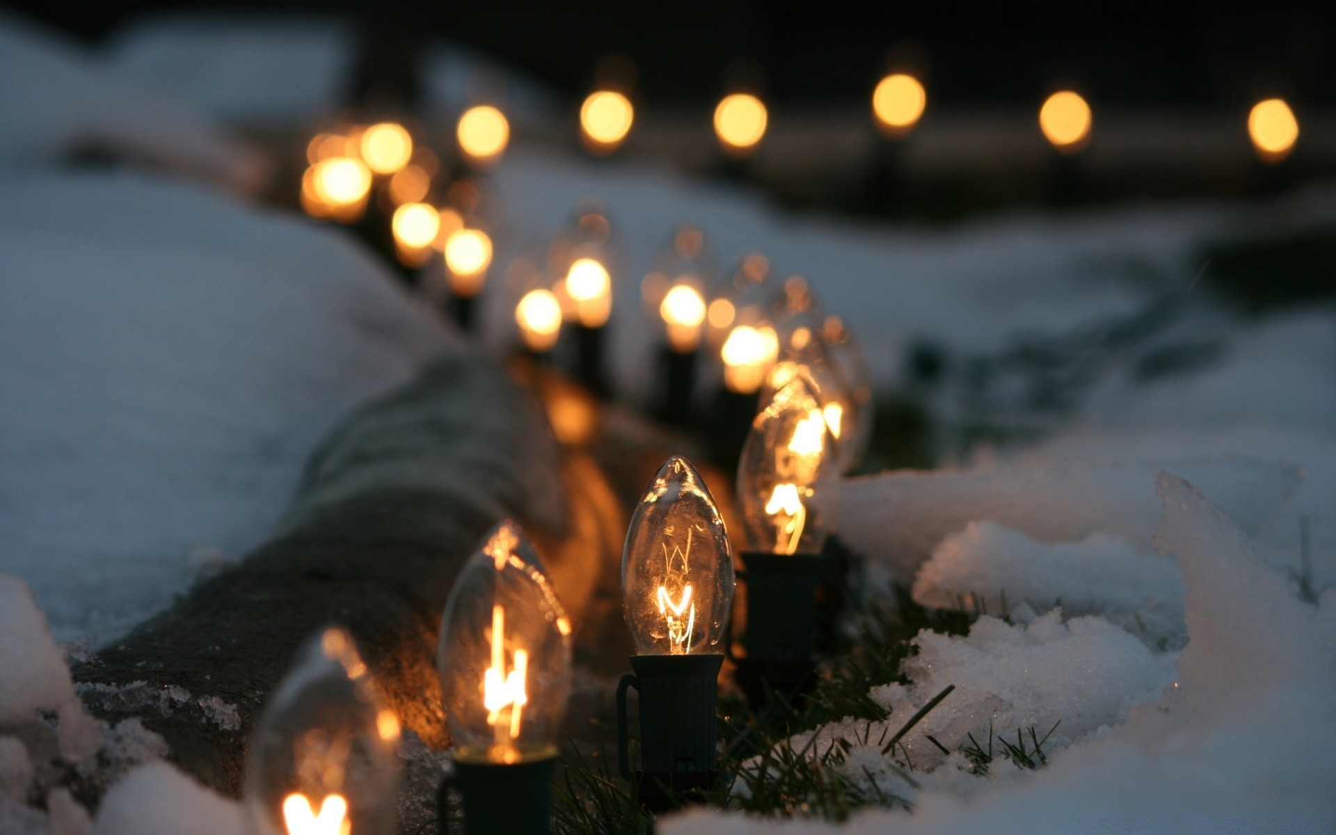 Regalo di Natale avvolto in carta dorata e un paio di palle di Natale su uno sfondo di luci