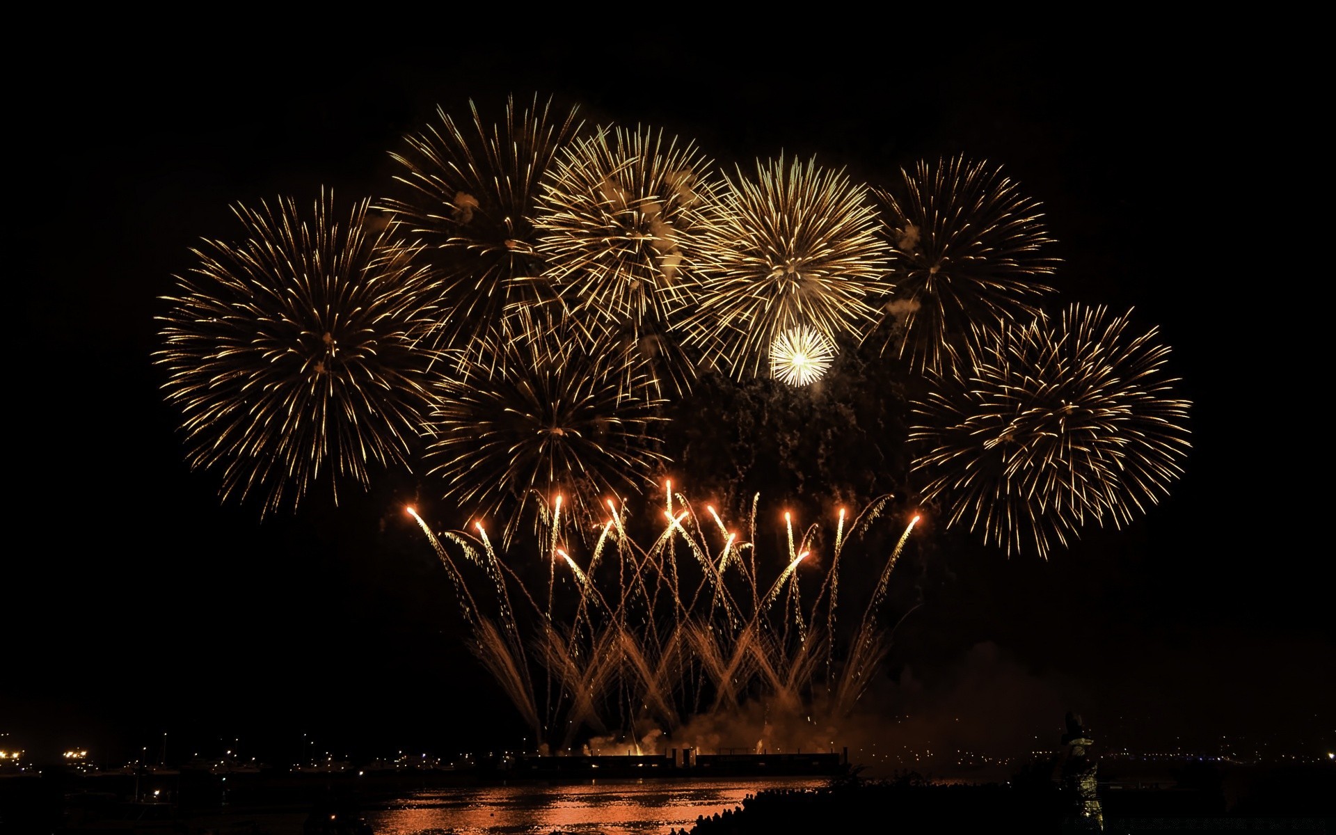 Palla di Capodanno con nastri su un ramo di abete rosso