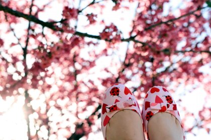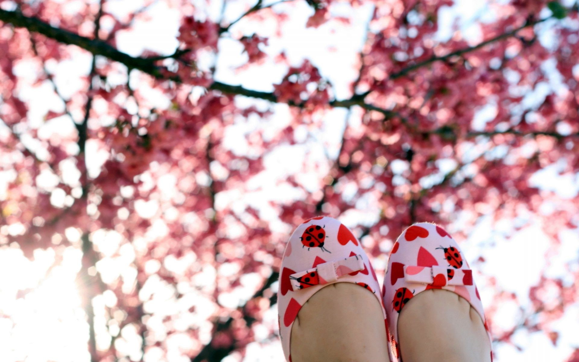 Piedi sollevati in scarpe su uno sfondo di fiori di ciliegioPiedi sollevati in scarpe su uno sfondo di fiori di ciliegio