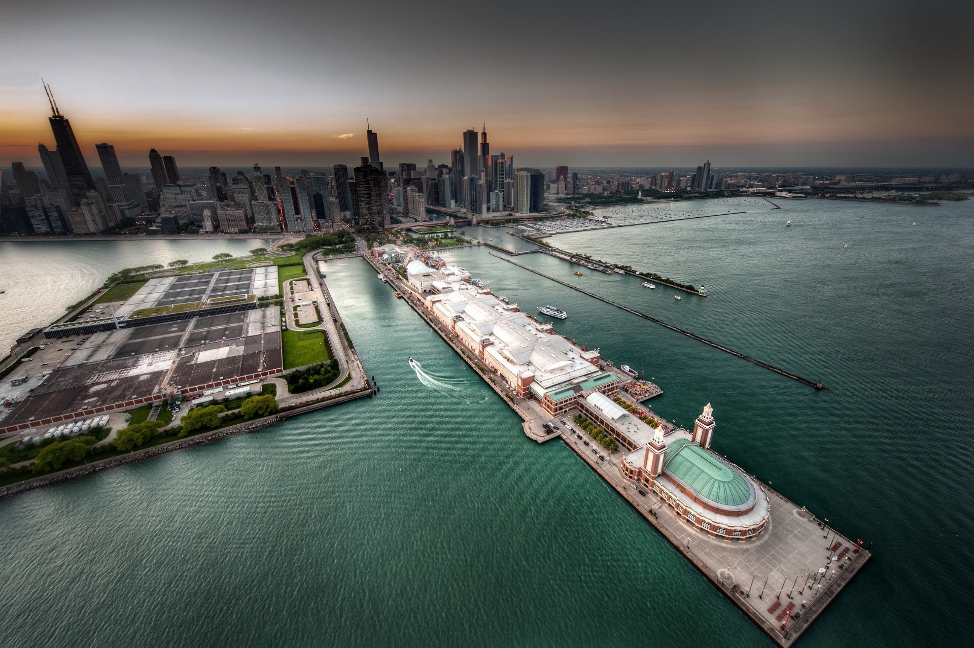 Foto monocromatica della città circondata dall'acquaFoto monocromatica della città circondata dall'acqua