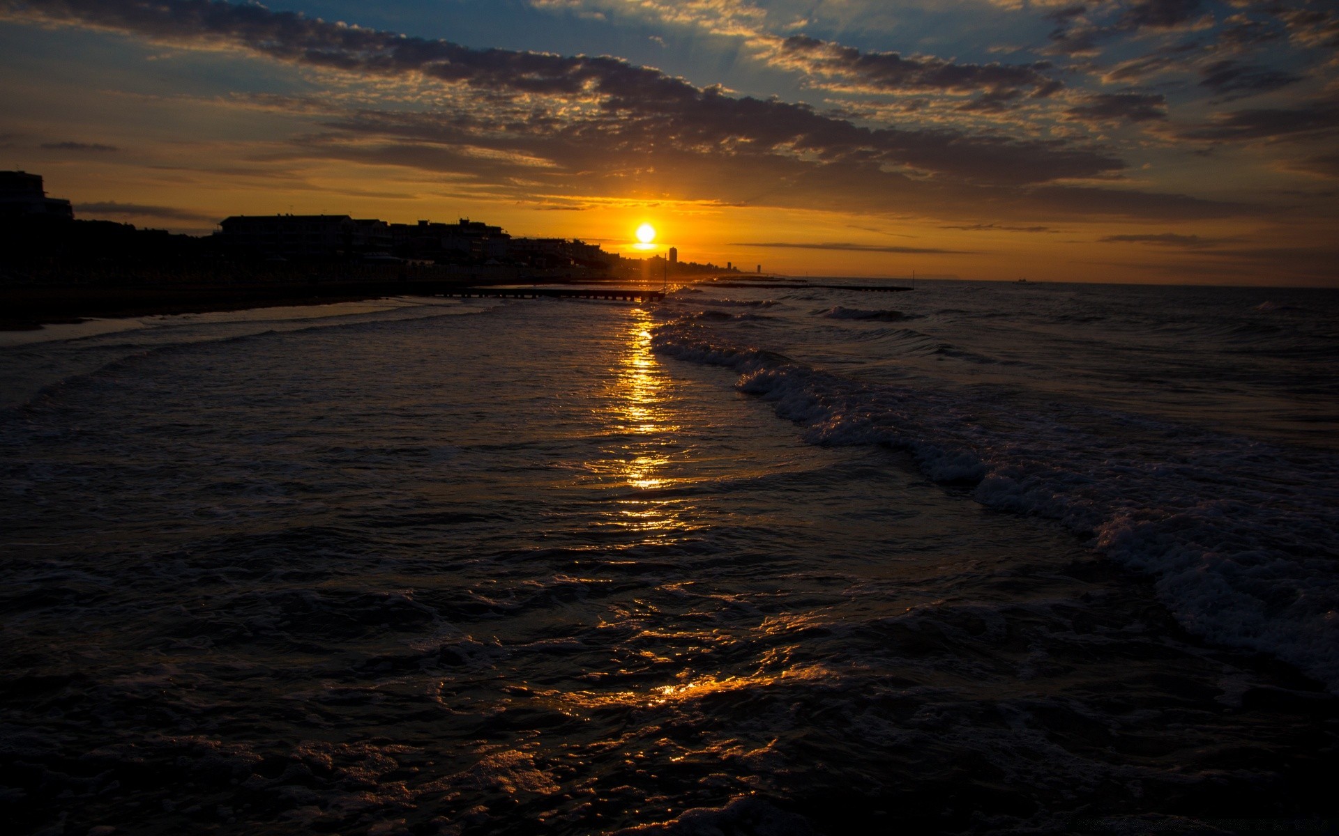 Bellissimo tramonto in riva al mare. Rocce all'orizzonte