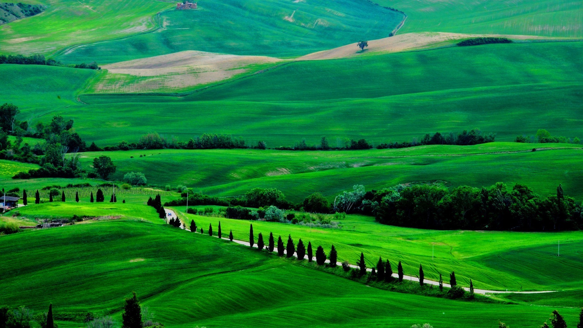 Campo con fiori rossi su sfondo di alberi e collinaCampo con fiori rossi su sfondo di alberi e Collina