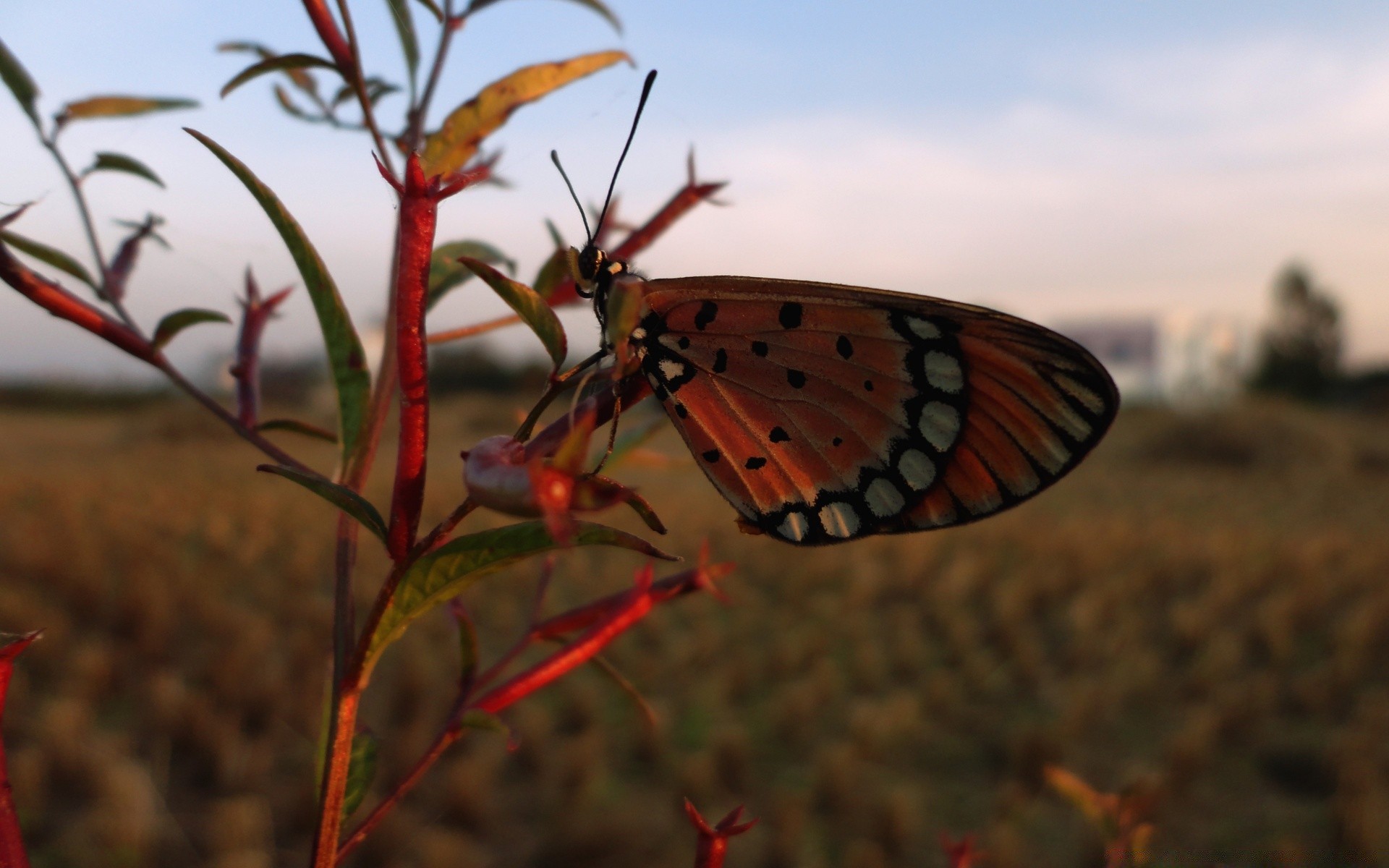 Piccola farfalla vicino su uno sfondo di raggi al tramonto