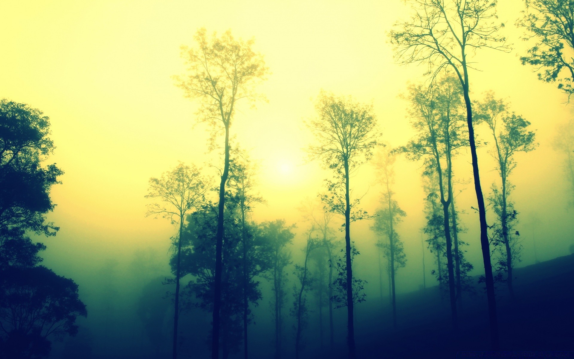 Alba e nebbia sugli alberi