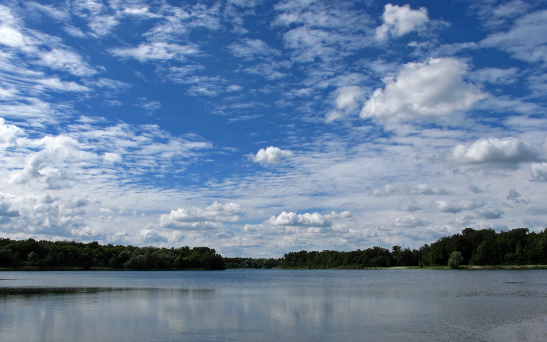 Paesaggio di lago, alberi e cielo blu con nuvole