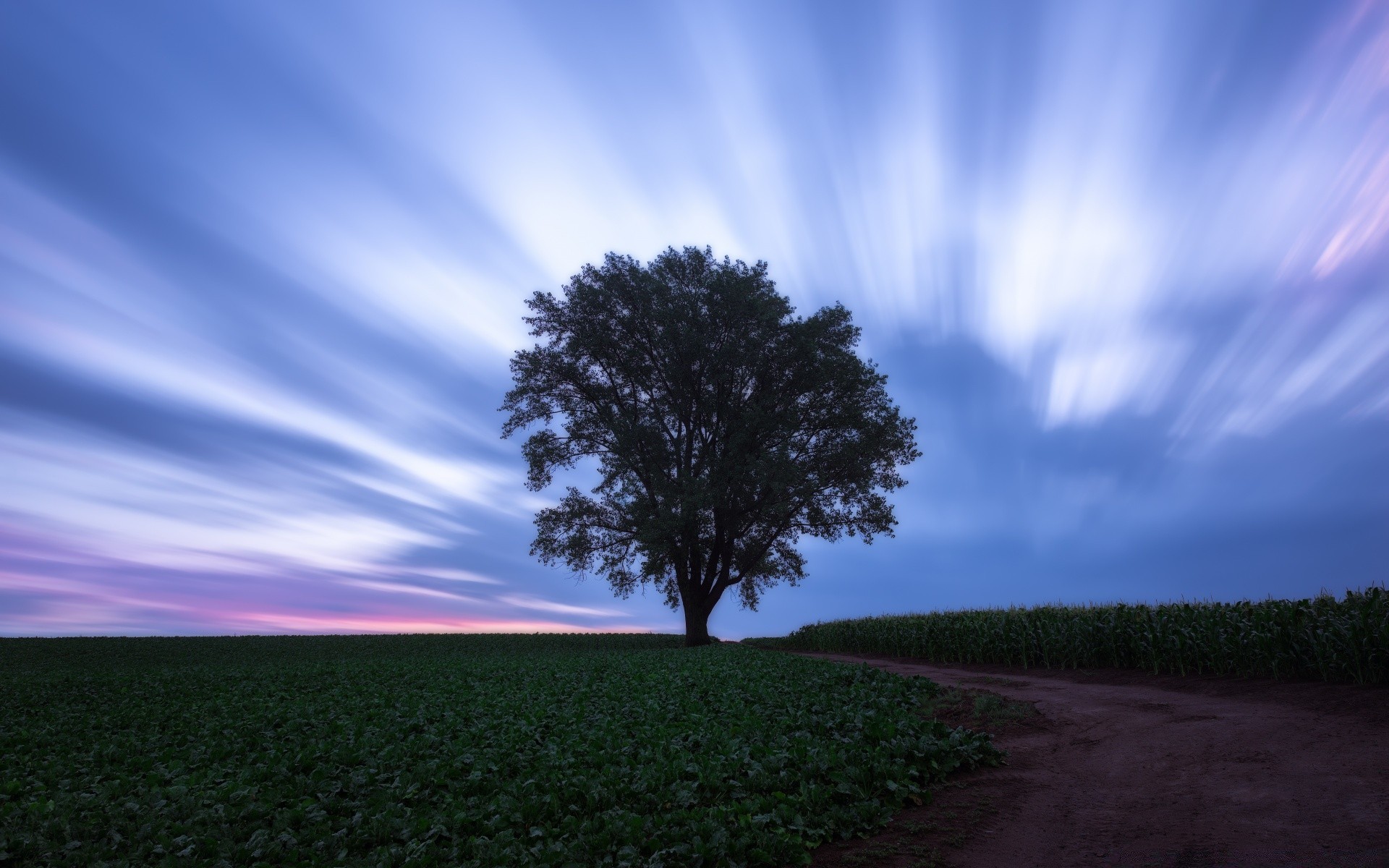 Paesaggio. Albero sullo sfondo del sole all'orizzonte