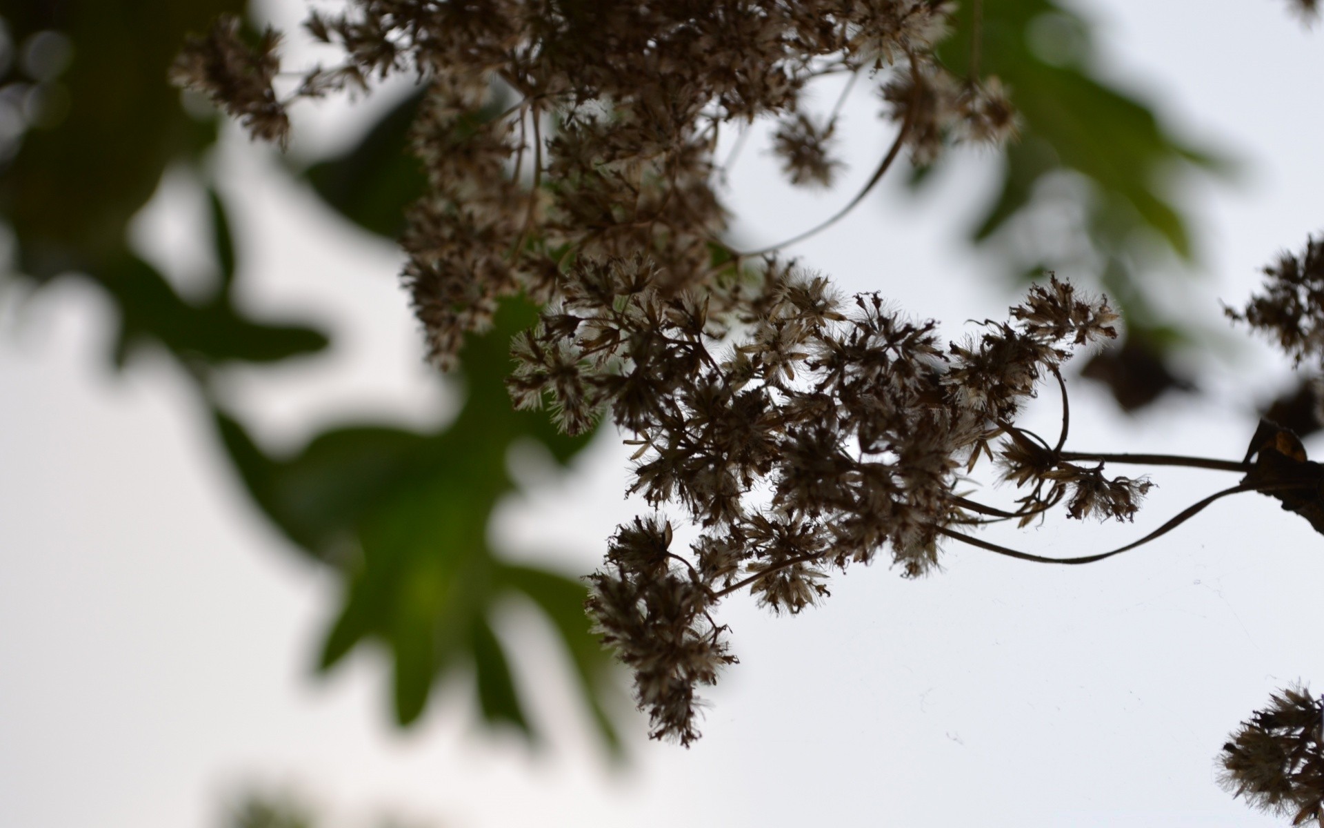Un ramo di albero scuro con messa a fuoco parziale sulla sua corteccia con uno sfondo chiaro sfocato