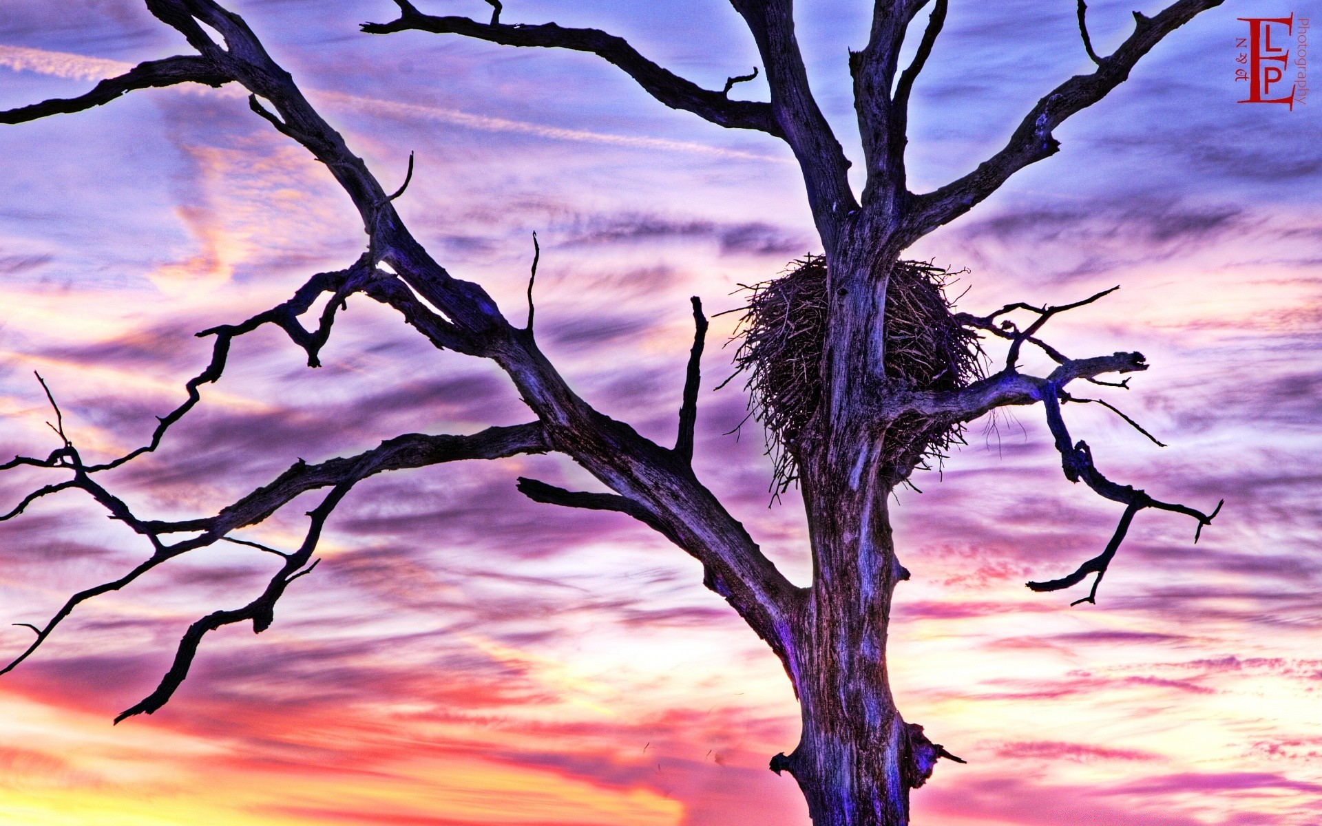 Nido su un albero nudo al tramonto