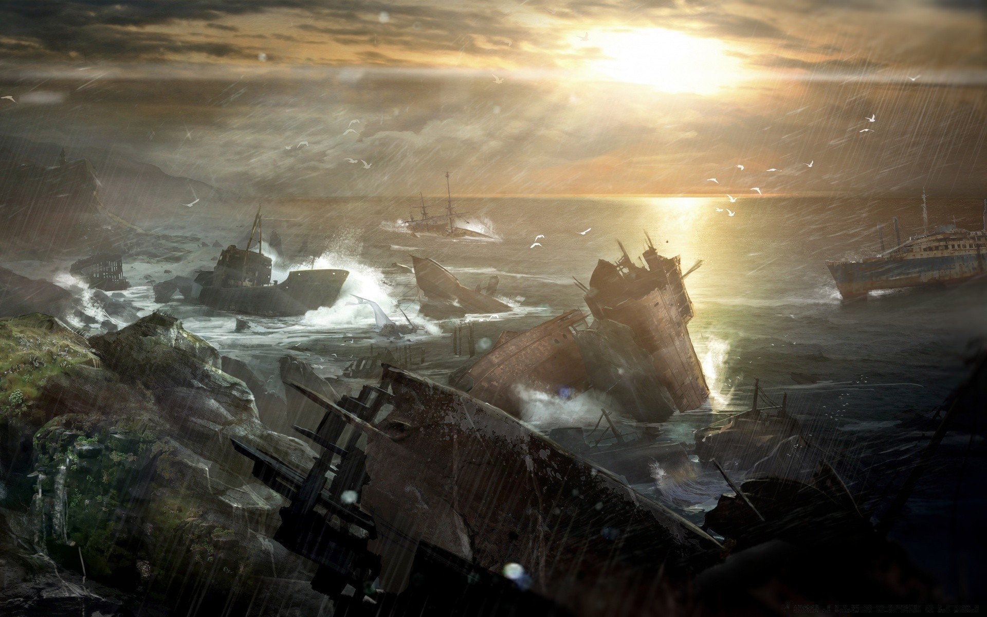 Mare emozionante vicino alla riva, dove vengono abbandonate navi e altre attrezzature