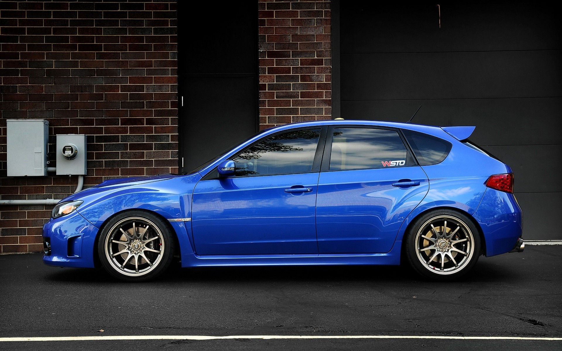 L'auto satura blu sulla strada sta di lato