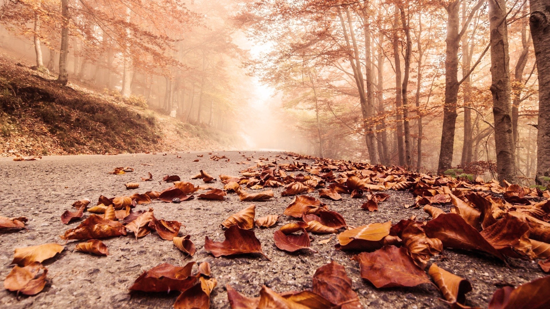 Foglie scarlatte sbriciolate dagli alberi della foresta