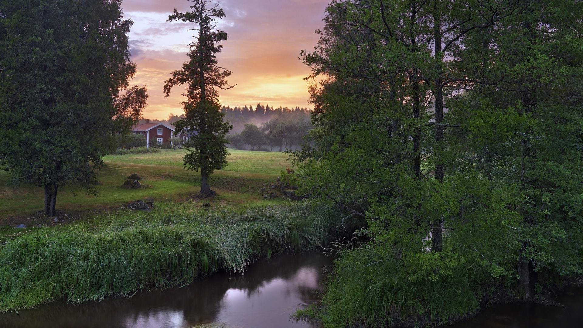 Cielo blu, sole accecante campo verde illuminato dal sole cocenteCielo blu, sole accecante Campo verde illuminato dal sole cocente