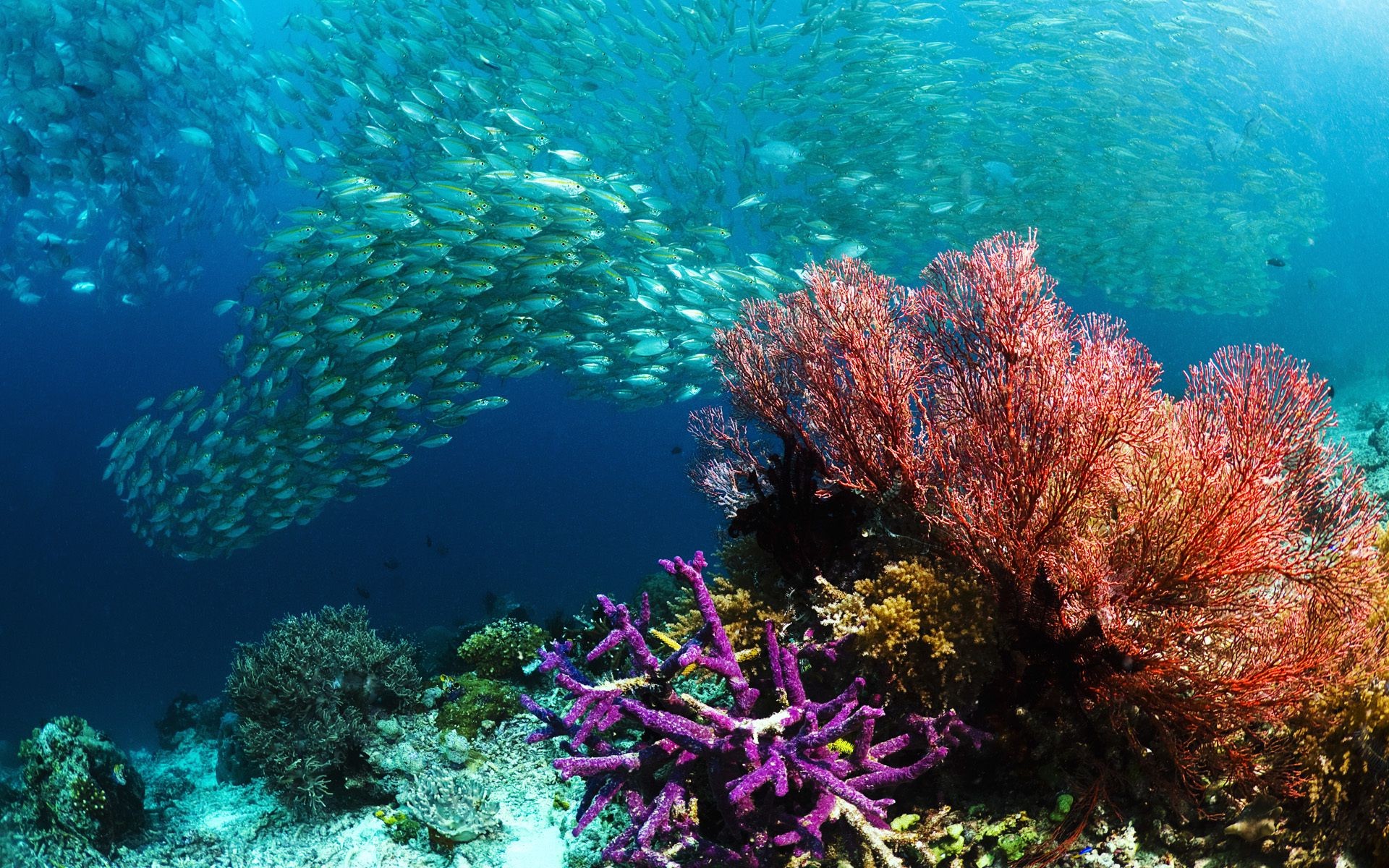 Danza rotonda di pesci tropicali vicino alla barriera corallina