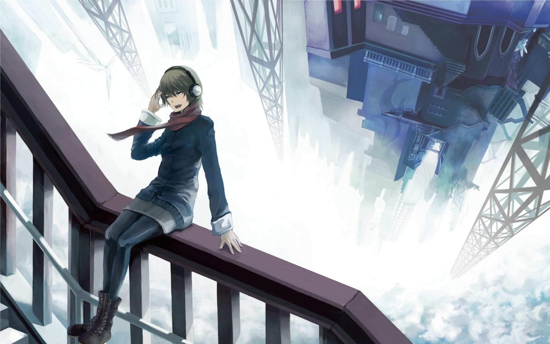 Ragazza anime in cuffia seduta sulla ringhiera sullo sfondo del progresso tecnologico