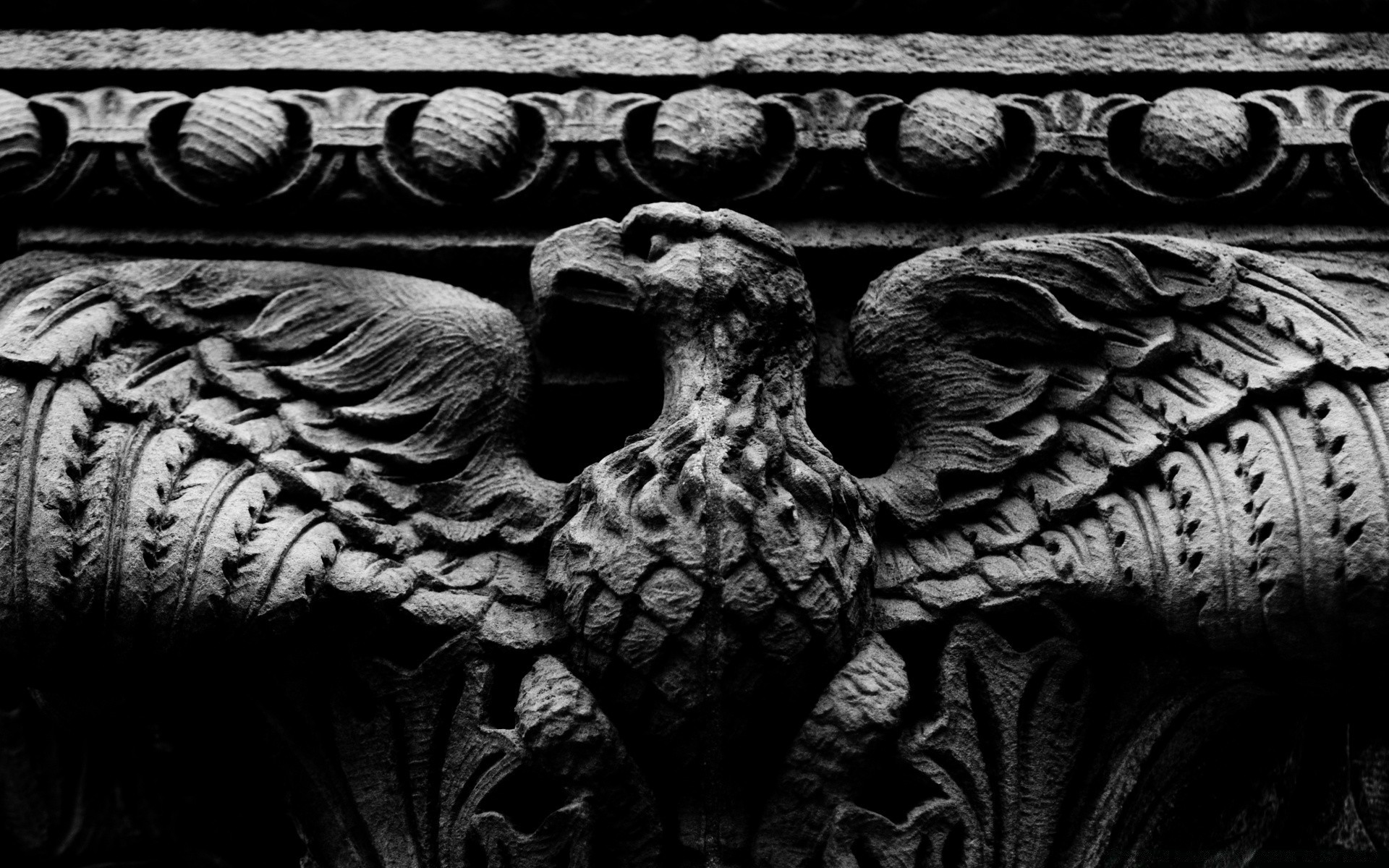 Un pezzo di terra volante contro il cielo da cui scorre una cascata e un'Aquila Bianca
