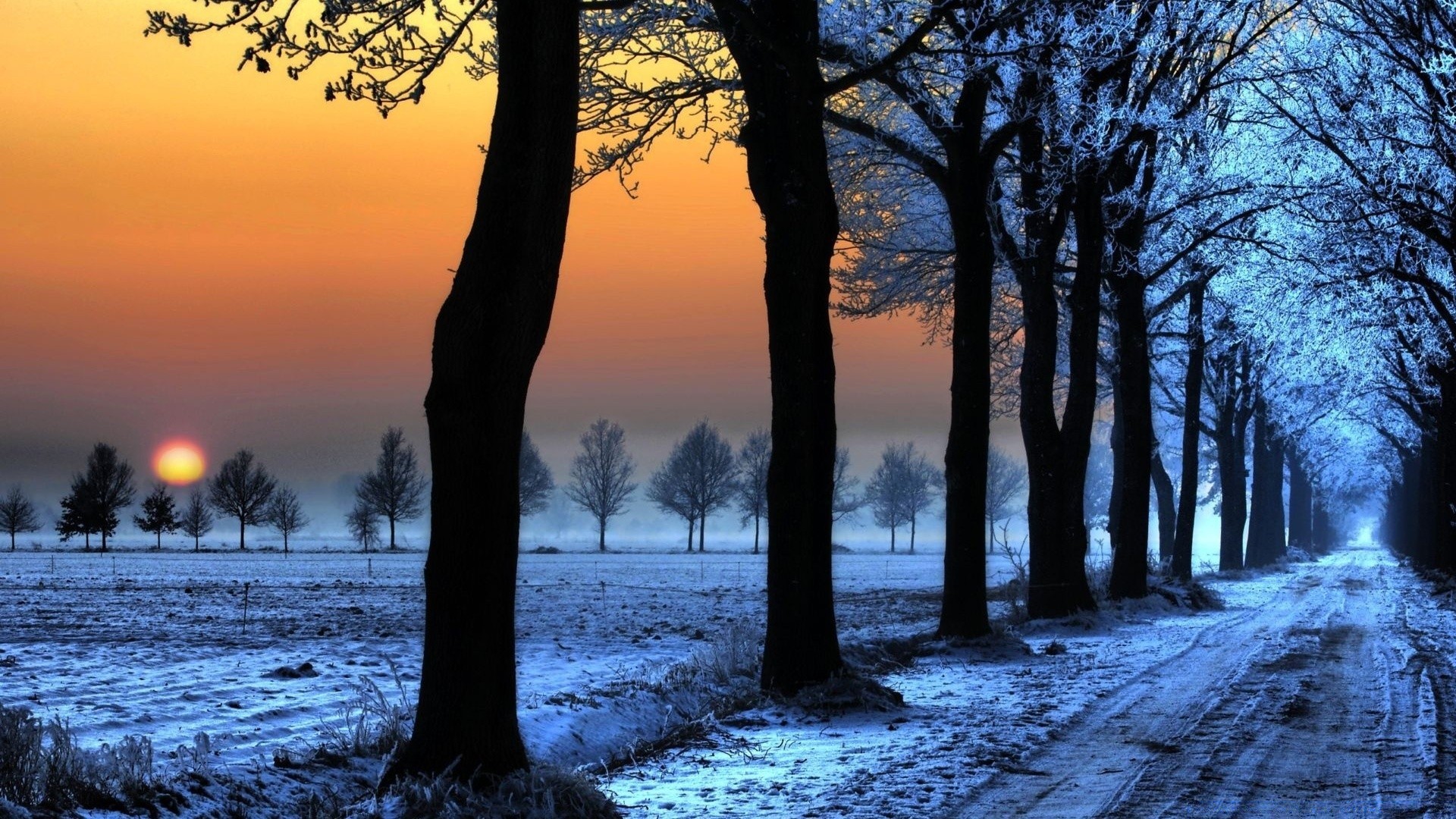 Paesaggio invernale con cielo arancione