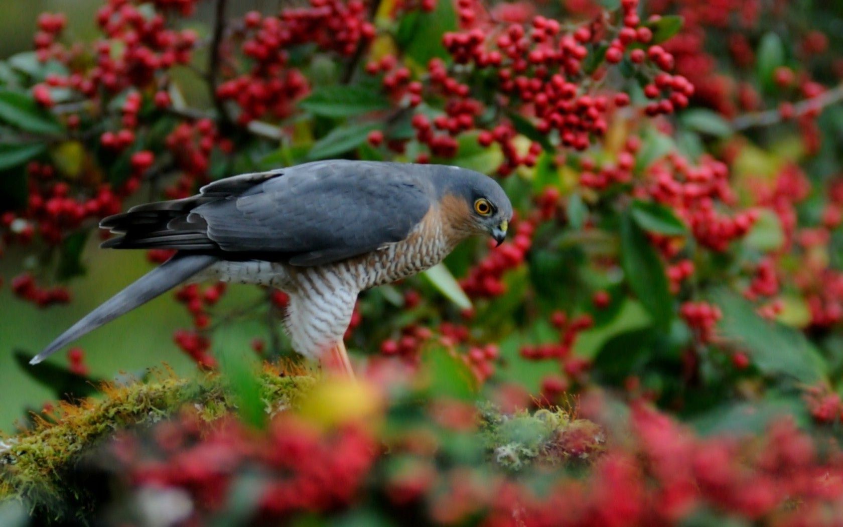 Uccellino seduto su un ramo di arbusto con bacche rosse