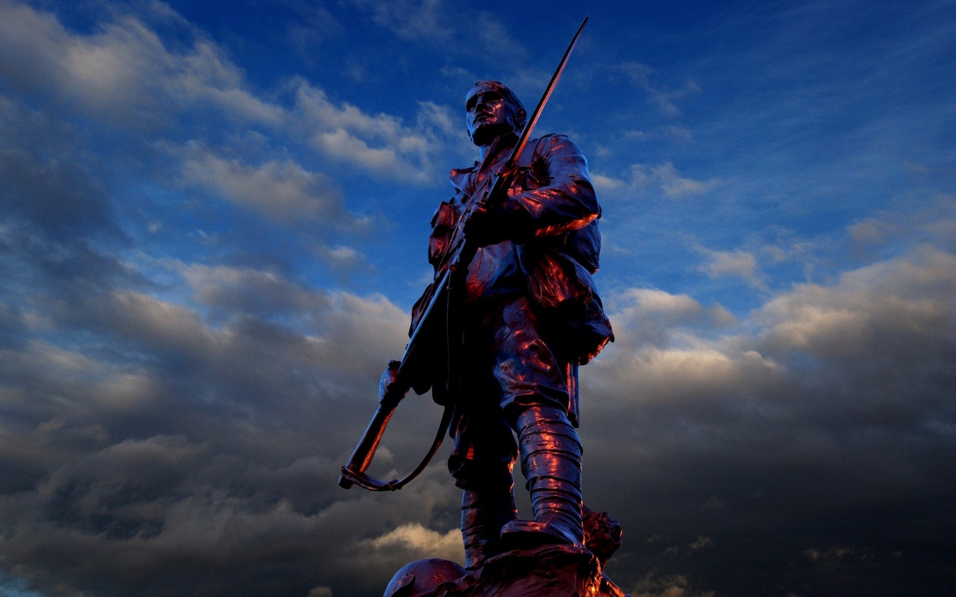 Uomo con le armi sullo sfondo del cielo nuvoloso