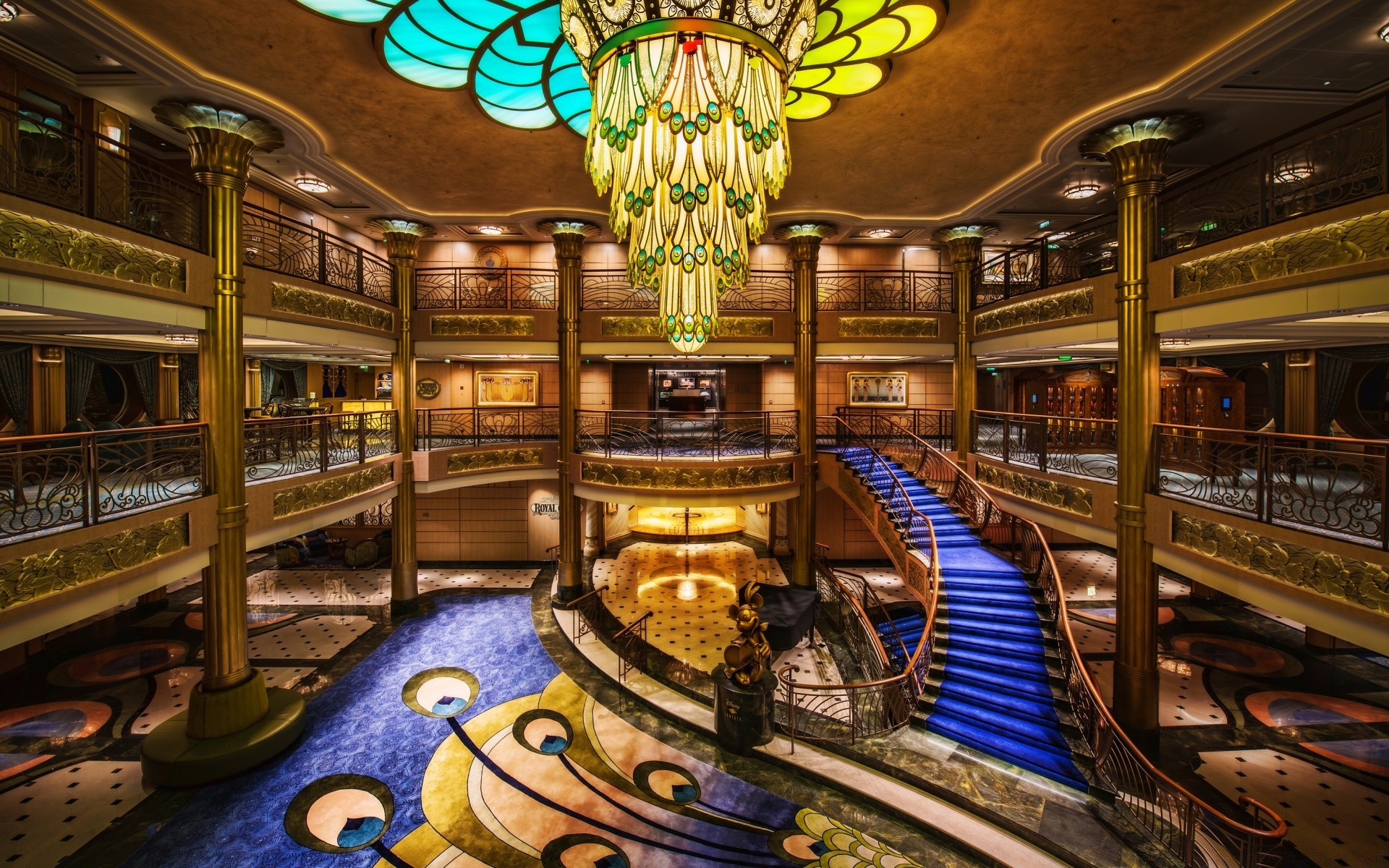 Soffitti e pareti dipinte con grandi lampade e pavimento in pietra colorata all'interno della Chiesa