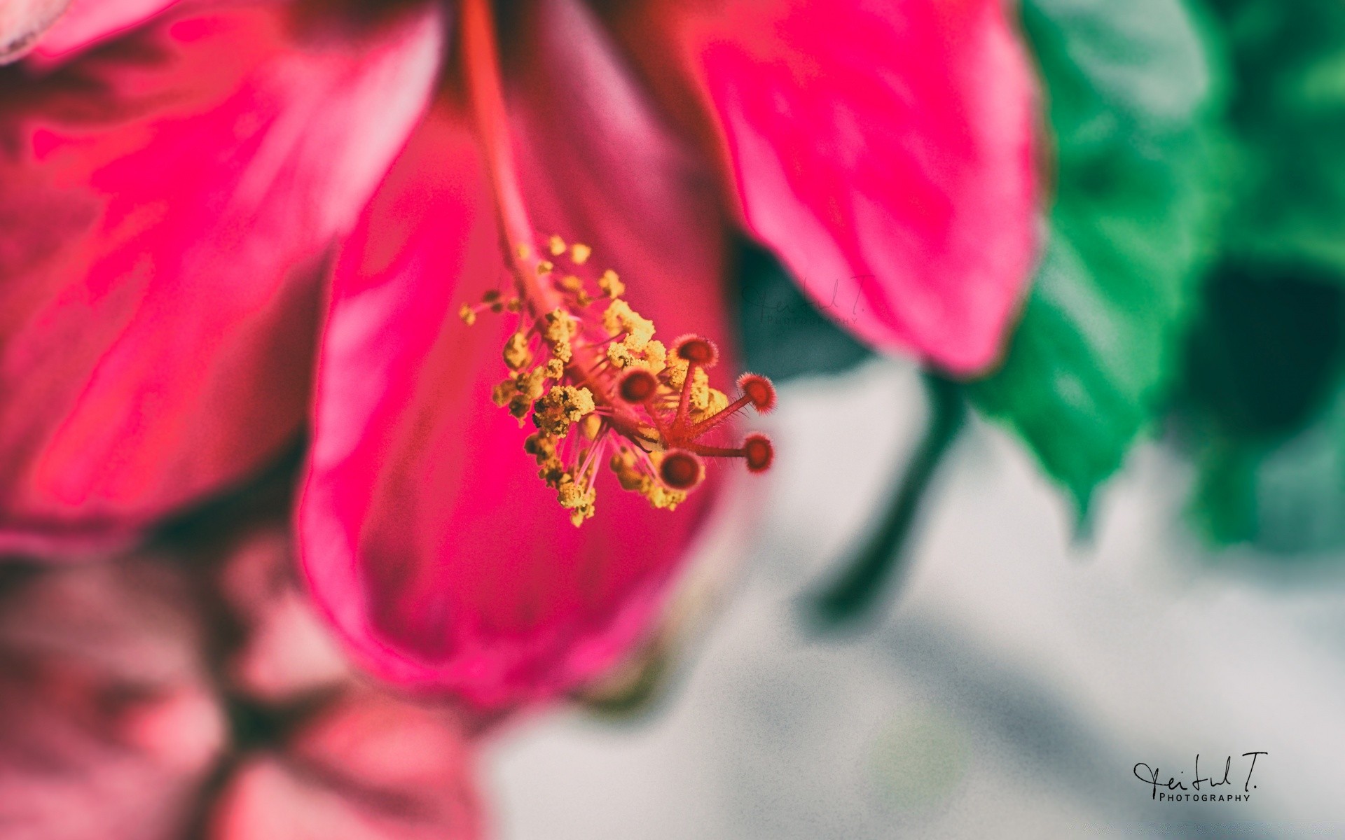 Fiore rosa a cinque petali con foglie verdi e pistillo giallo