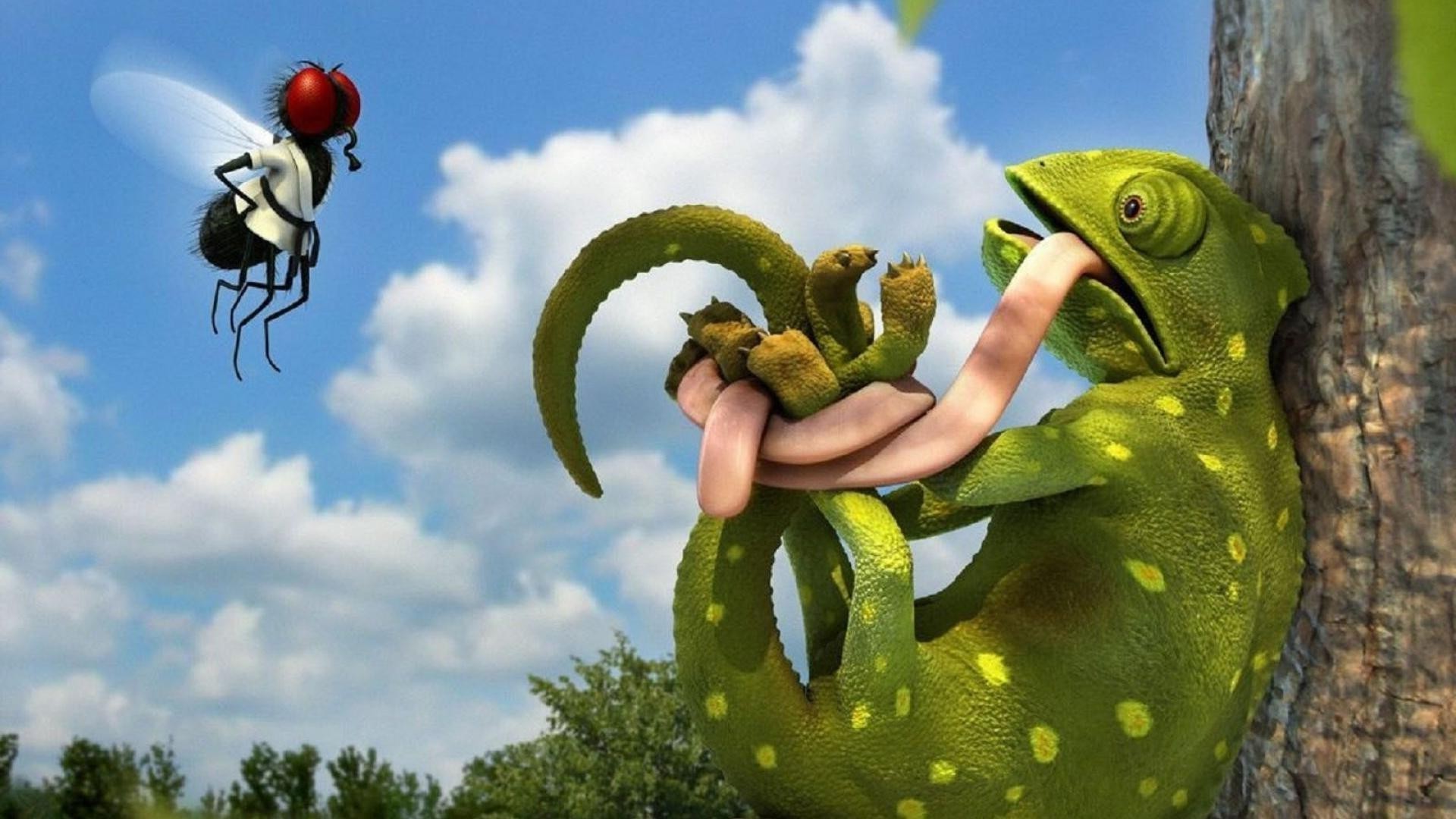 Camaleonte e Mosca su uno sfondo di nuvole bianche