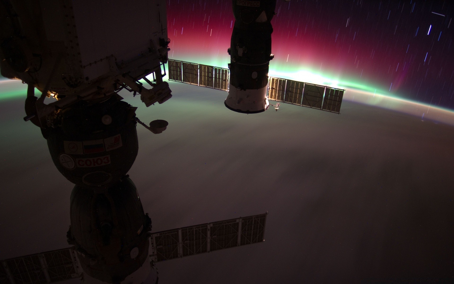 Foto di veicoli spaziali dallo spazio sullo sfondo dell'aurora boreale