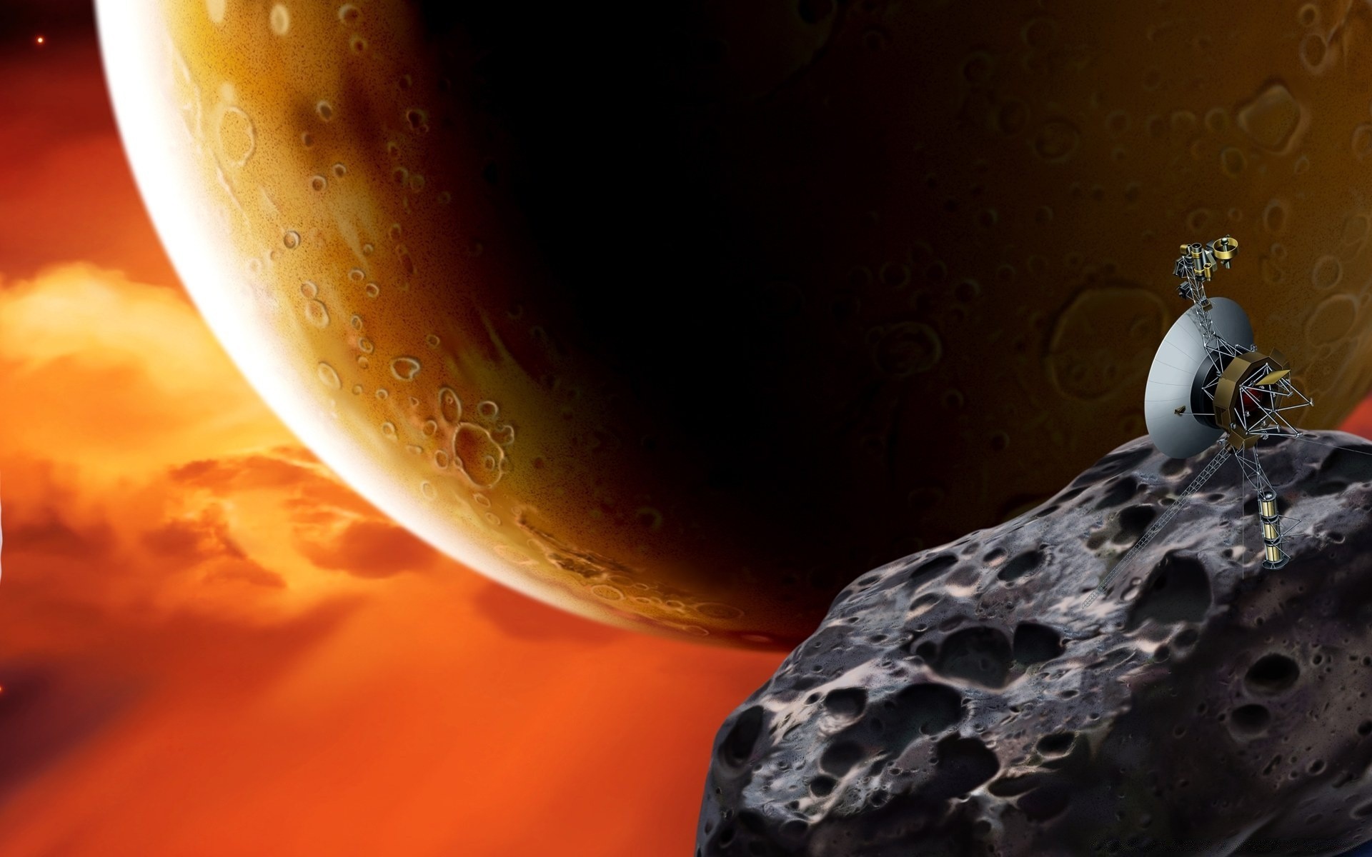 Pianeta e asteroide. Il veicolo spaziale osserva gli oggetti