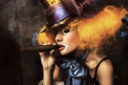 Donna in trucco da clown con sigaro