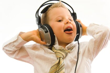 Bambino allegro che ascolta musica