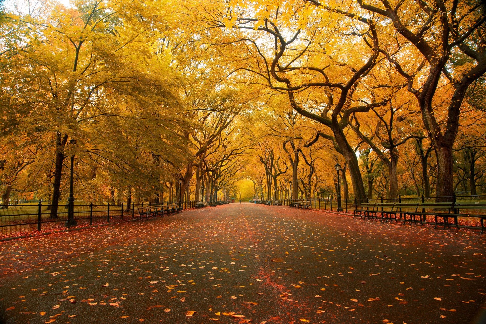 Parco autunnale desertico con lettiera di foglie