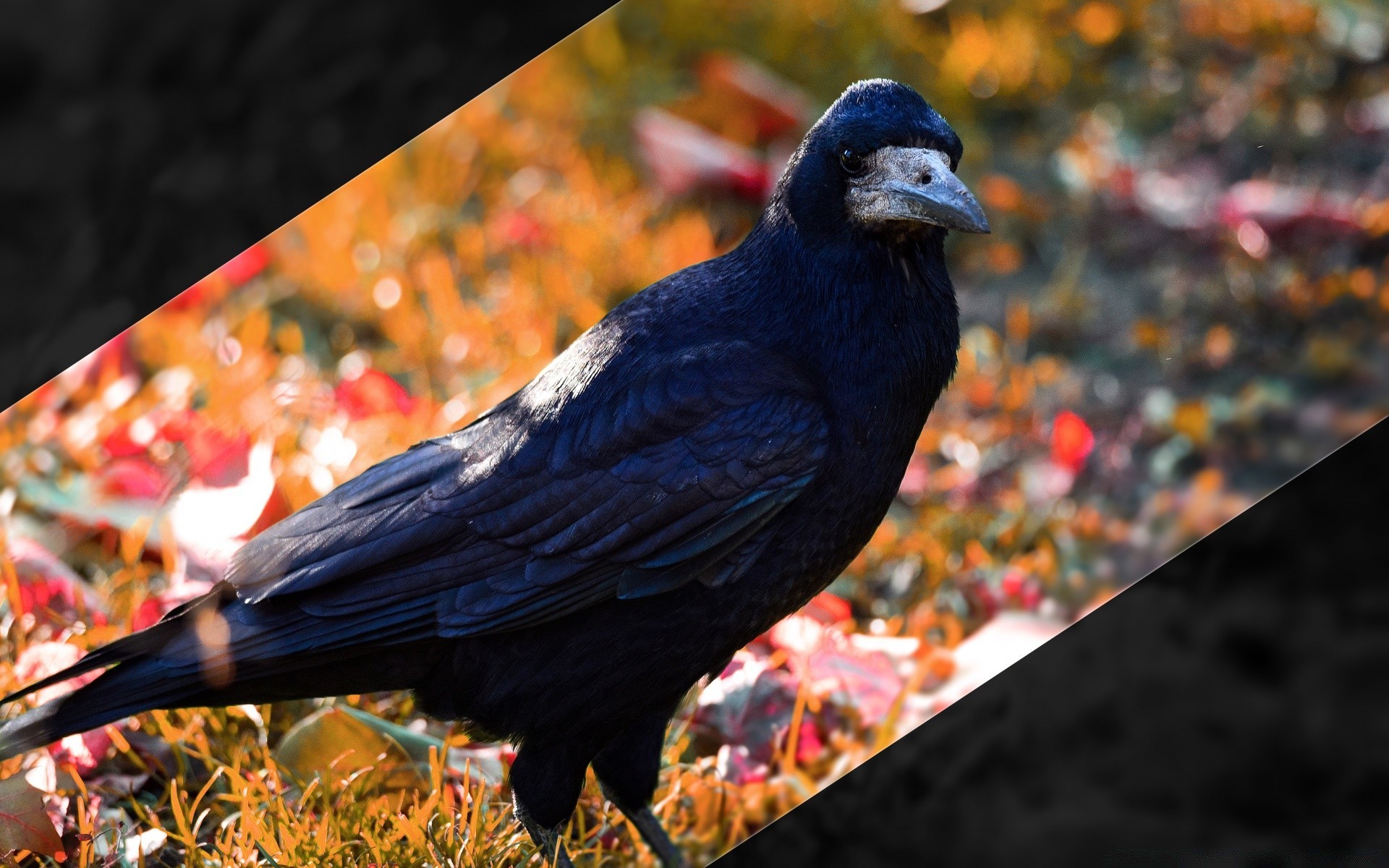 Corvo sullo sfondo del fogliame autunnale. Uccello nel parco