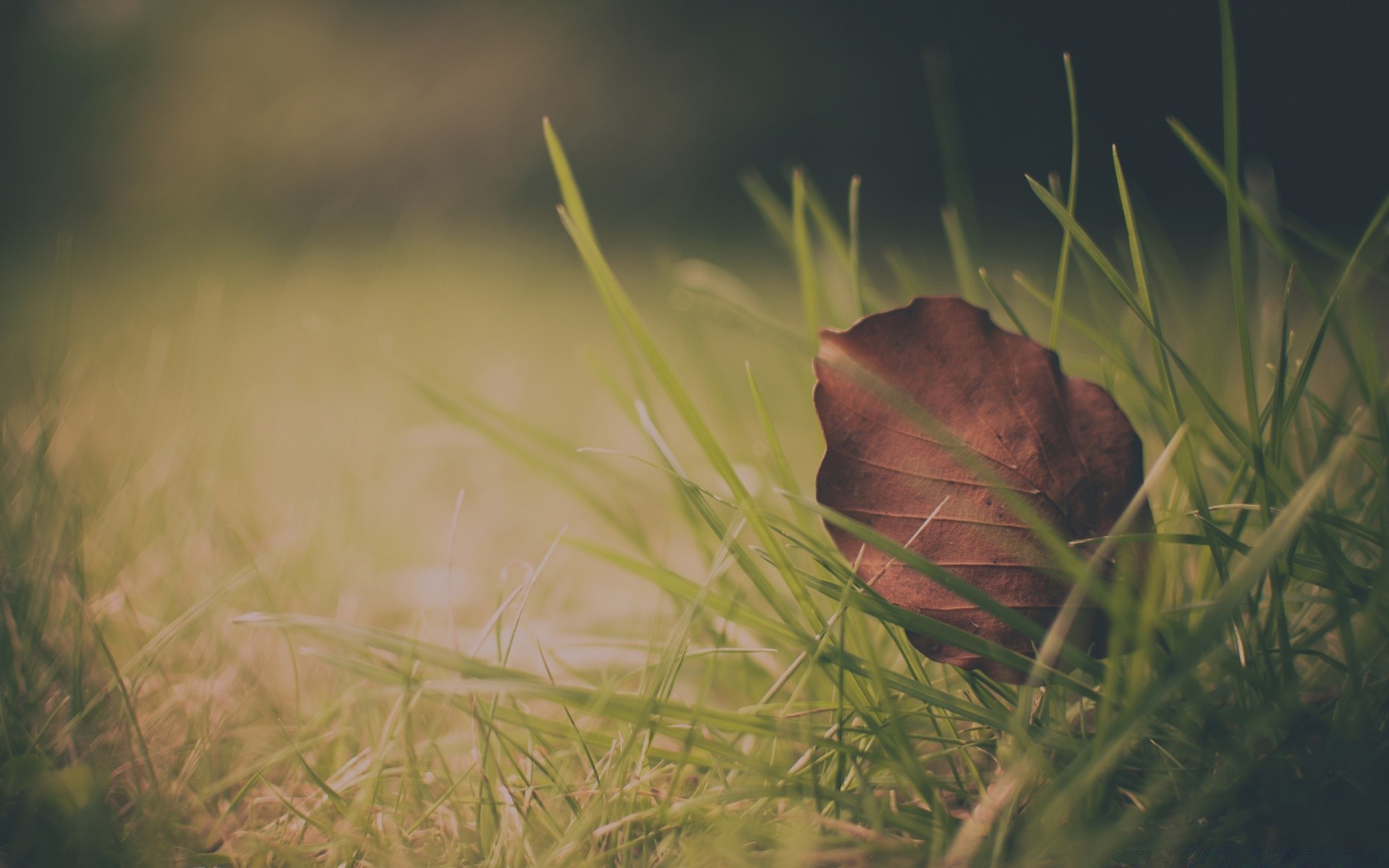 Foglia secca autunnale in erba verde