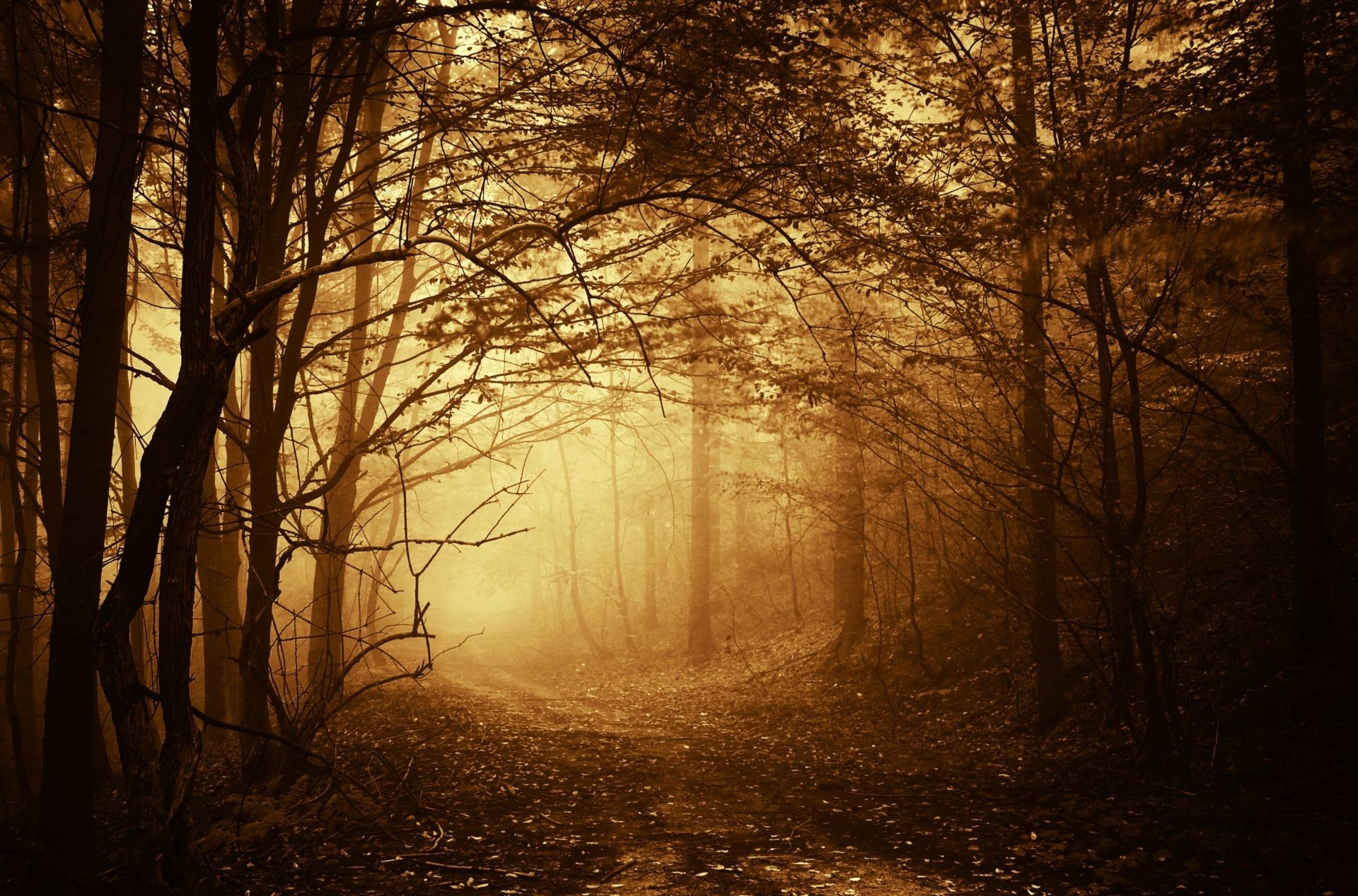 Una panchina di legno si trova nella foresta autunnale tra le foglie gialle cadute
