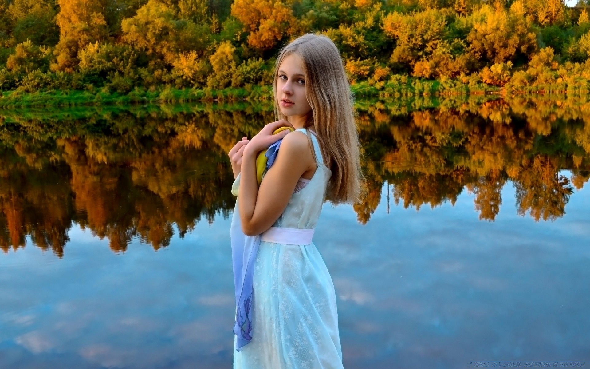 Ragazza sullo sfondo del paesaggio autunnale