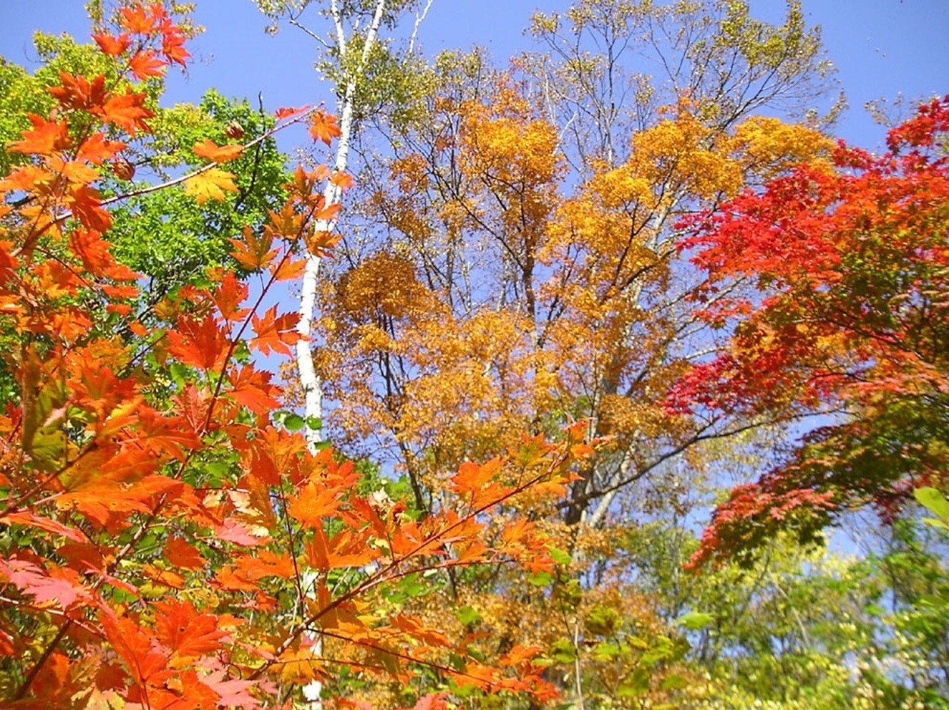 Foresta autunnale con foglie luminose su uno sfondo di cielo blu