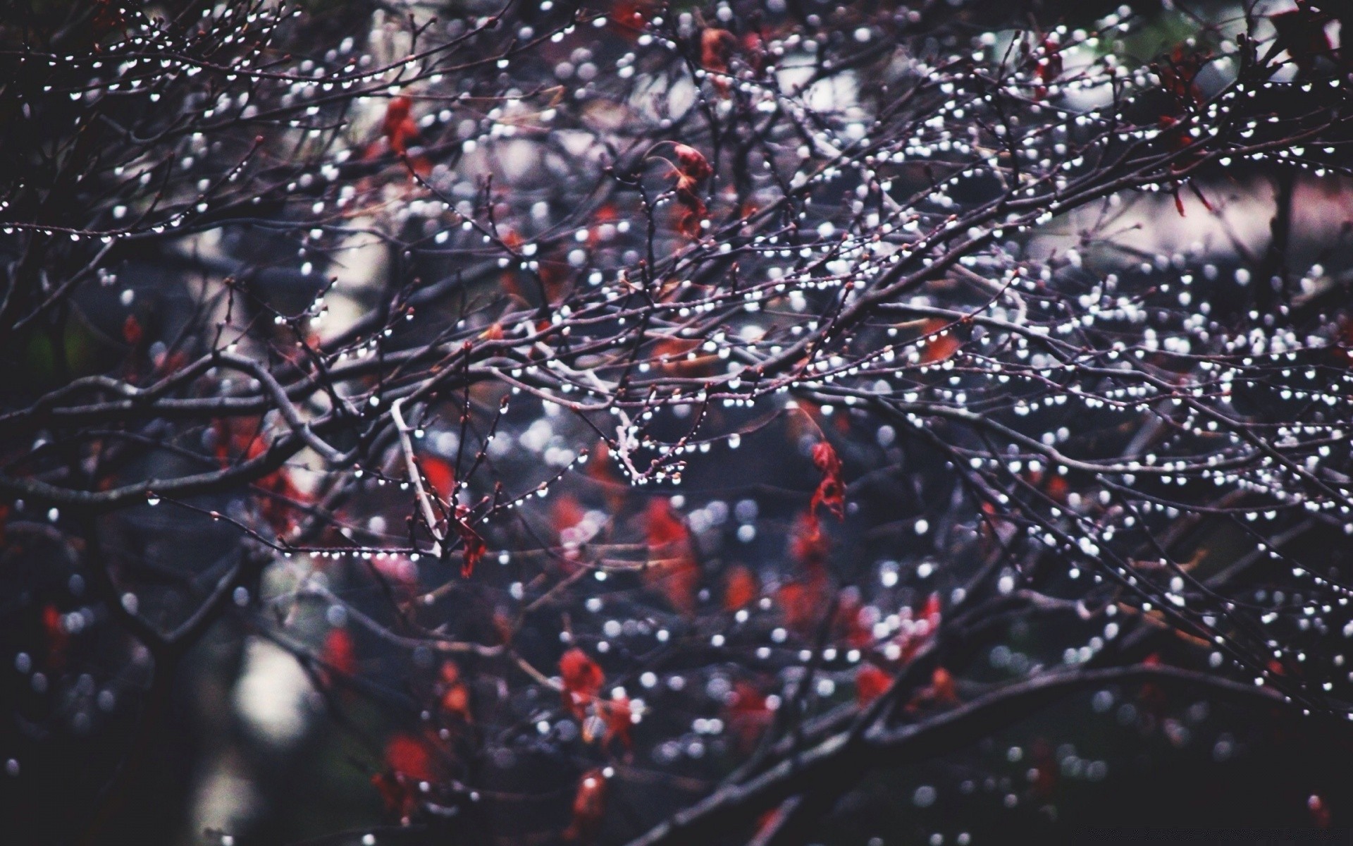 Ramoscello bagnato con grandi gocce su uno sfondo di bacche rosseRamoscello bagnato con grandi gocce su uno sfondo di bacche rosse