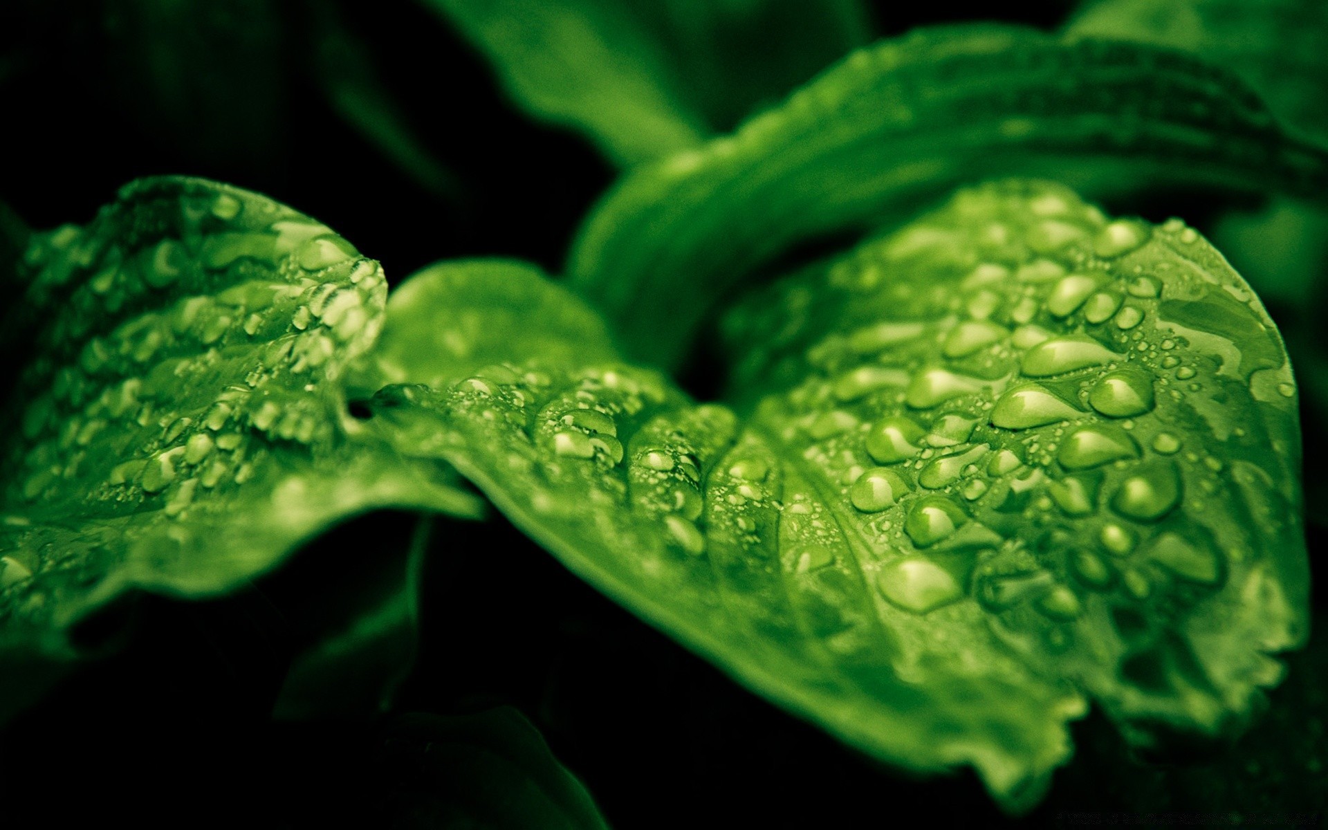 Gocce d'acqua rotolanti su grandi foglie lucide