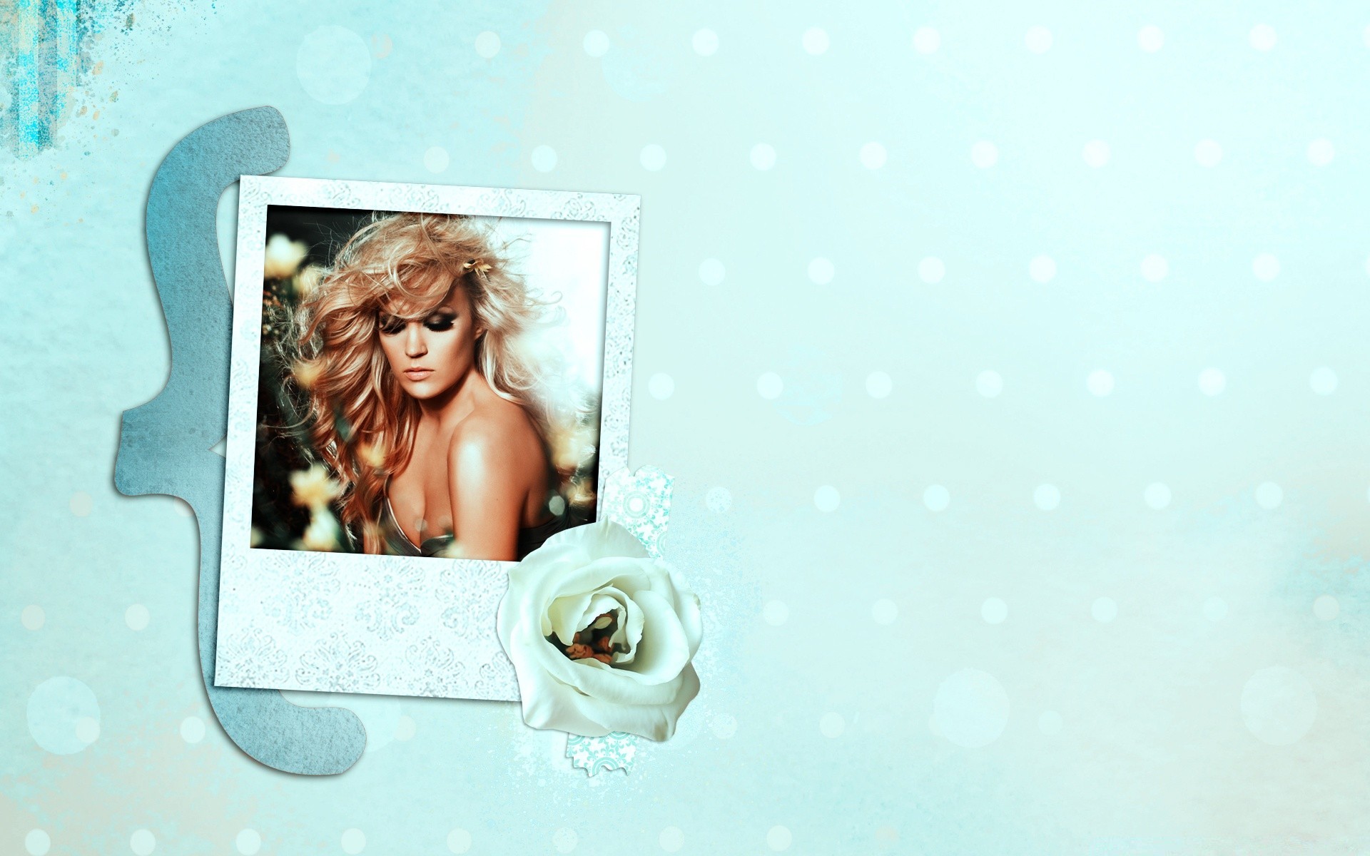 Foto polaroid di una donna bionda adulta. Foto di donna su sfondo azzurro